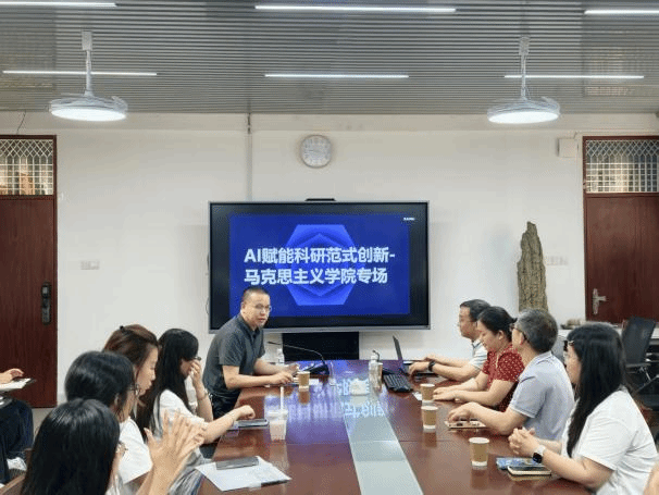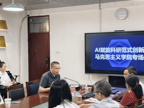 在综中404举办“AI赋能科研范式创新”专题讲座,讲座由校图书馆陈添源馆长主讲,学院党委副书记邓战军主持,图书馆相关馆员老师及学院各年级研究生和本科生代表参加。