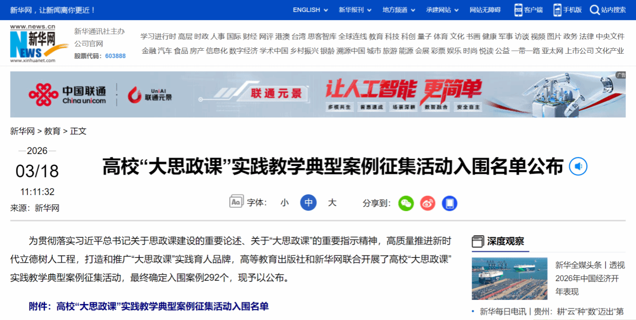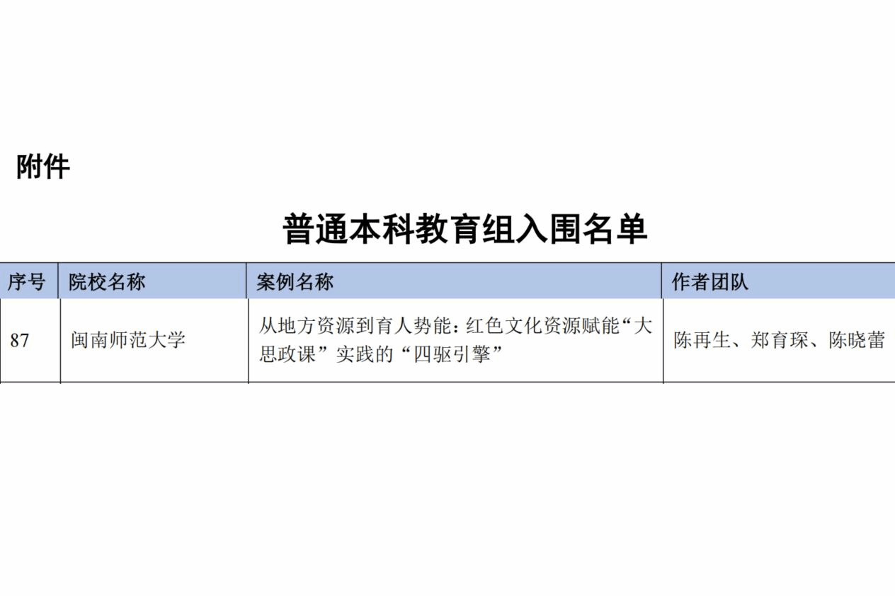 陈再生、郑育琛、陈晓蕾团队申报的《从地方资源到育人势能:红色文化资源赋能“大思政课”实践的“四驱引擎”》案例成功入选。