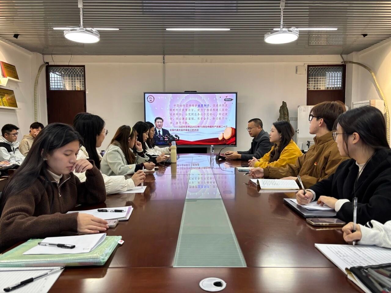 党委副书记邓战军在综合楼中区404会议室为在校学生党员讲授题为《在构建人类命运共同体背景下,浅谈中日关系变化与思考》的党课,部分在校学生党员参加。(通讯员 黎秀文)