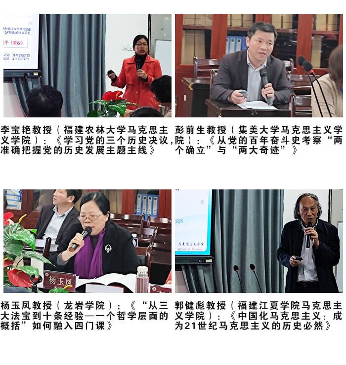 舒展教授、福建农林大学李宝艳教授、集美大学彭前生教授、龙岩学院杨玉凤和吴珍平教授、福建江夏学院郭健彪教授、福建商学院林萍教授、泉州师范学院郑长青副教授、漳州职业技术学院张锐鸿副教授等专家学者分别围绕党的百年历程、十九届六中全会精神、思政课教学、党的三个历史决议等方面发表了自己的观点,展开了热烈的讨论。大家认为,十九届六中全会精神融入思政课教学,要以贯彻落实《关于加强新时代人兽性交