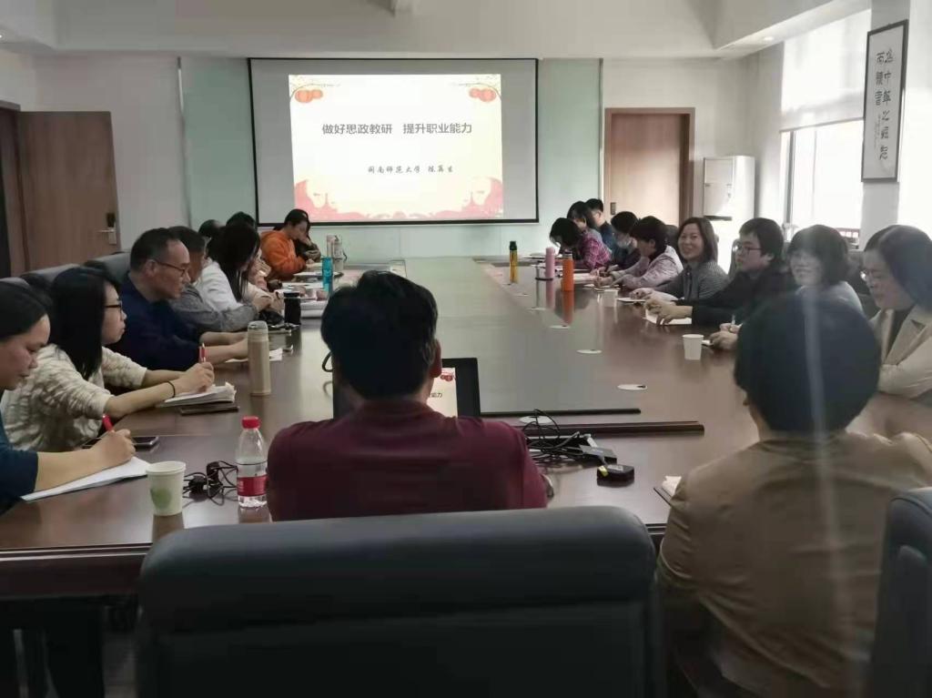 教师做了《做好思政教研 提升职业能力》专题报告。陈再生教授从政策、理论、实践等角度阐述了教研之于思政课教师职业成长的意义,并结合个人教研经历与体会,传授了思政课教师开展教研的要领与收获。与会思政课教师表示,陈教授对思政教研的见解是实实在在的“干货”,受益匪浅。