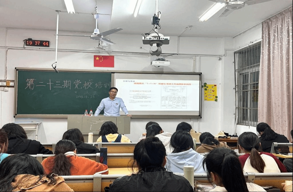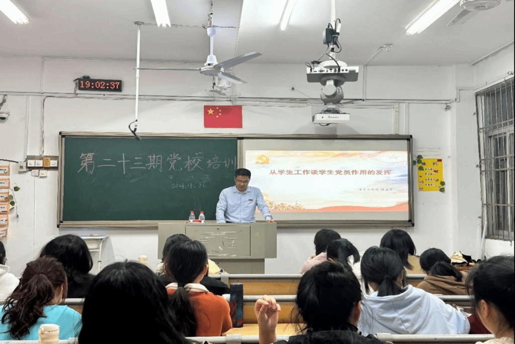 第二十三期入党积极分子培训第六讲在综南201举行。本次培训以《从学生工作谈学生党员作用的发挥》为主题,由校学生工作处林正锋老师主讲,全体入党积极分子参加。