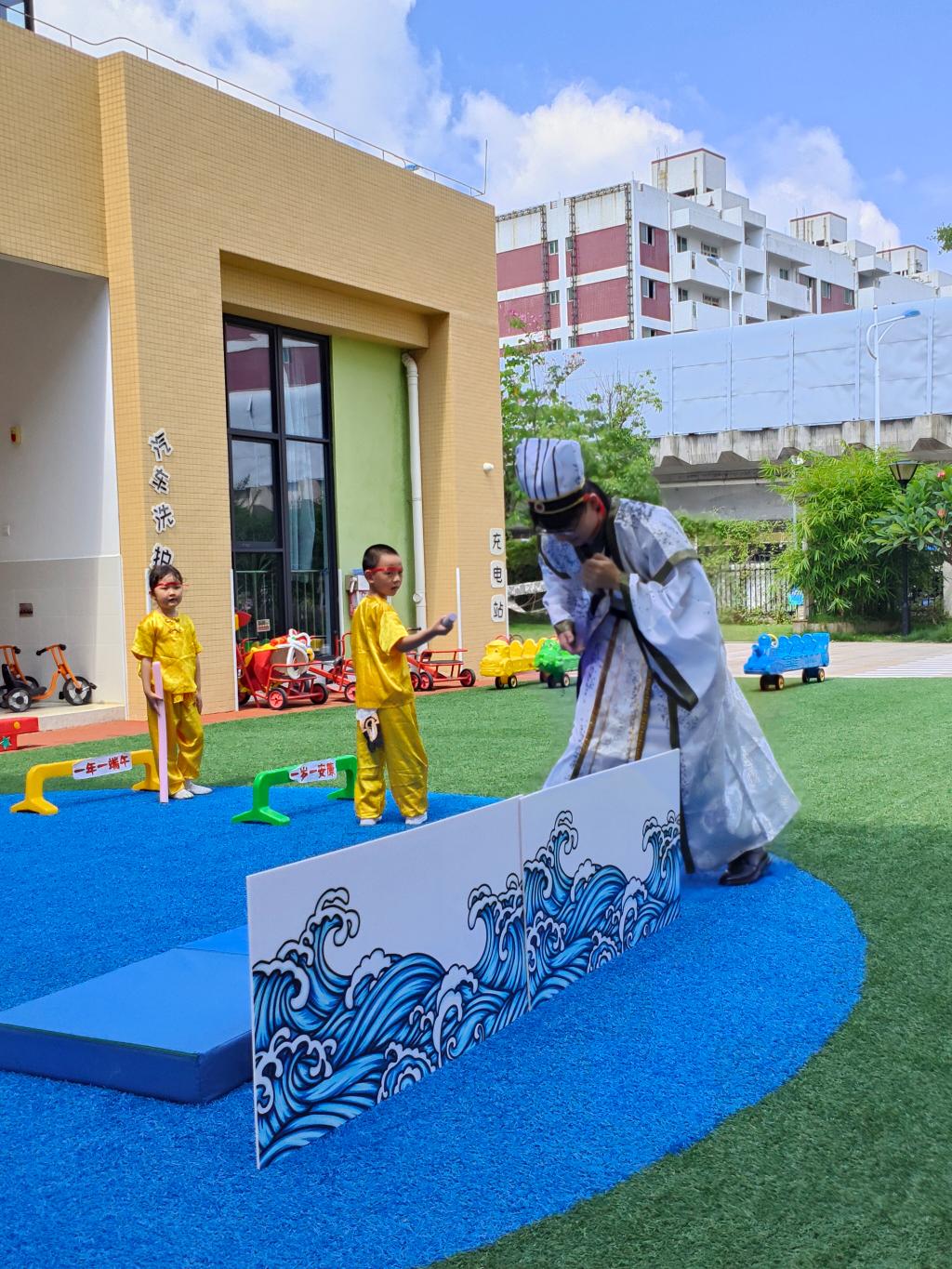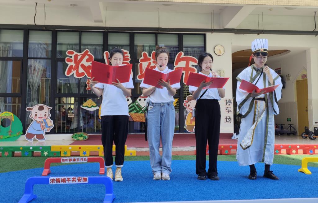 附属幼儿园共同演绎了《屈原》舞台情景剧,故事主要讲述了在战国时期,楚王任用屈原等贤臣,国力大涨,版图不断扩大,这时楚王被胜利冲昏头脑,终日不理朝政,最终被迫前往秦国议和,被秦王扣押,又过几年后,秦国攻破楚国国都,屈原听到悲愤交加,怀抱石头投汨罗江而死,这一天恰巧是五月初五。