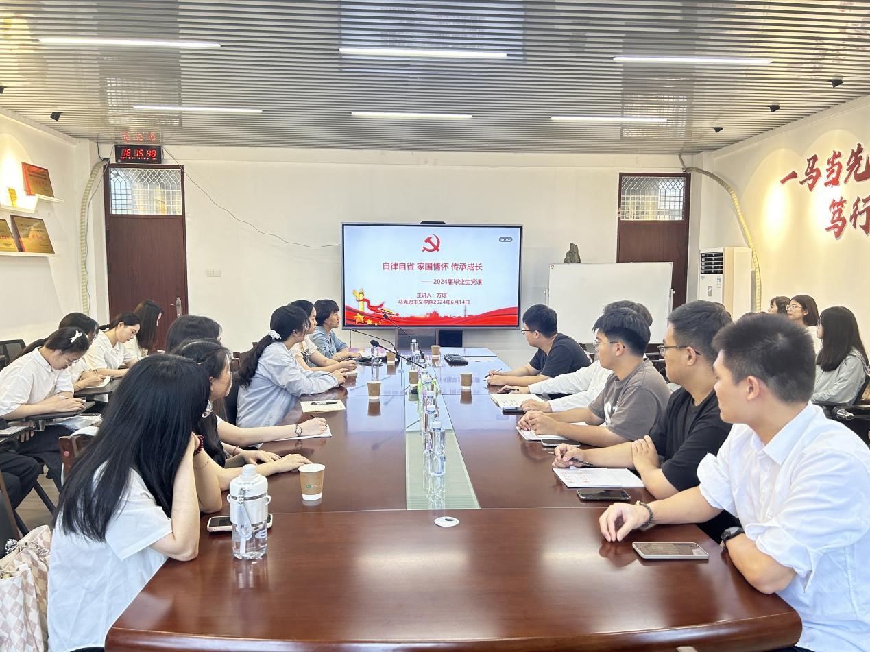 6月14日下午,院党委书记方琼在综合楼中区404会议室为2024届毕业生党员讲授题为《自律自省 家国情怀 传承成长》的“最后一堂党课”,全体在校毕业生党员参加。