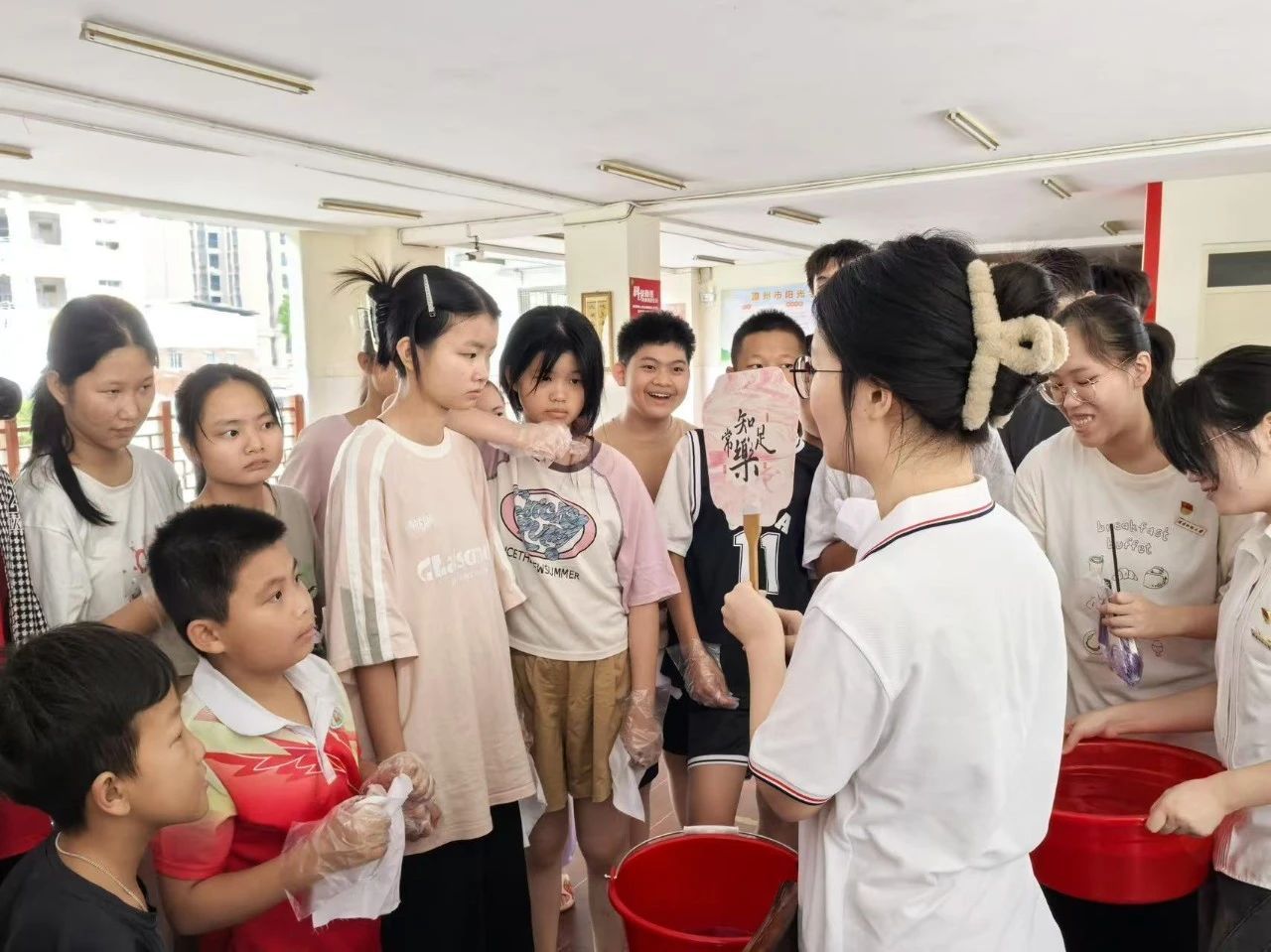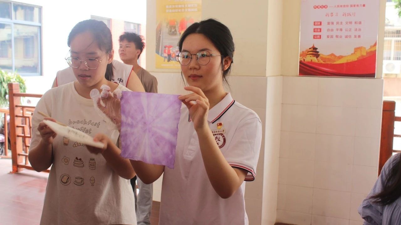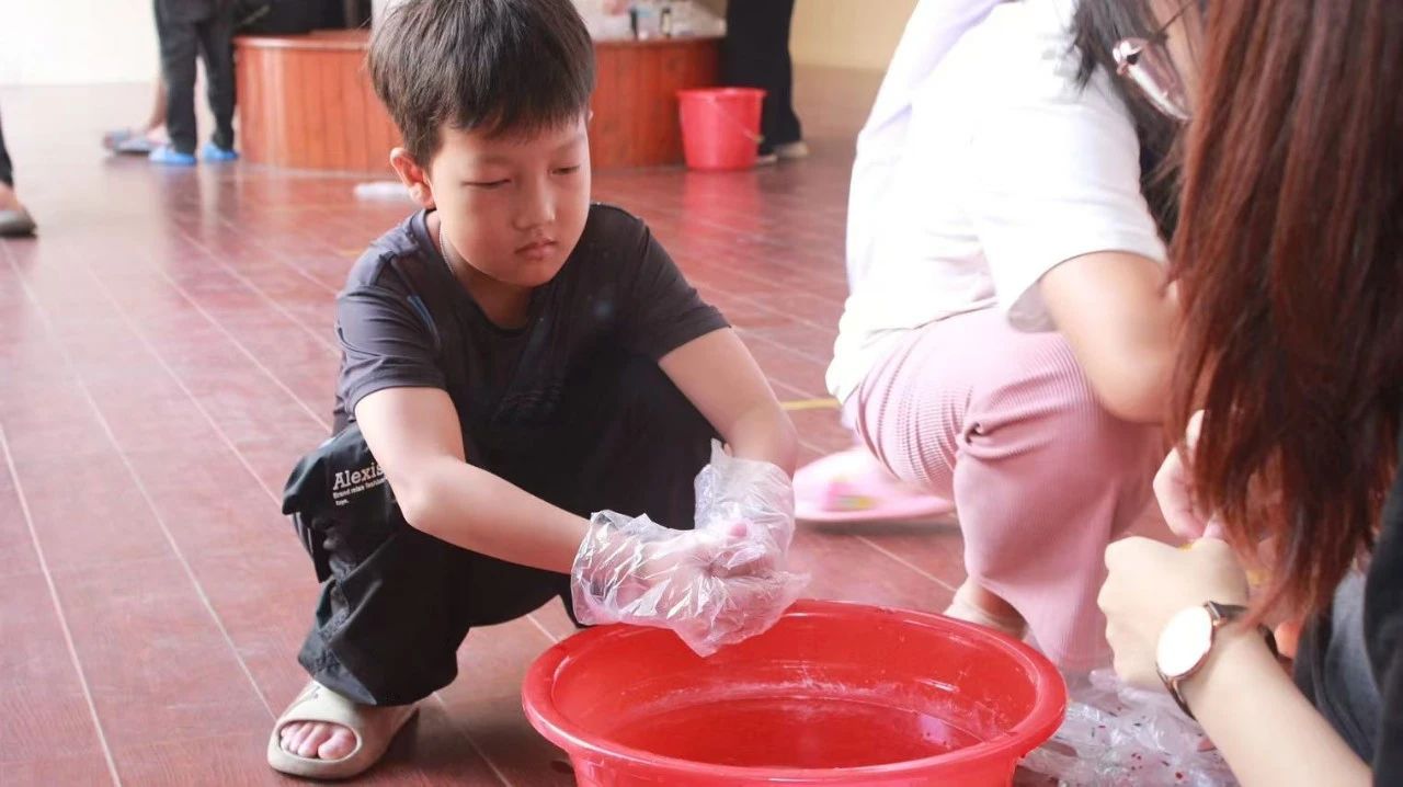 扎染作为非物质文化遗产项目之一,不仅是中国传统手工染色技术的代表,更是民间智慧的结晶,展现了中华民族的创造力与审美追求。支部党员声情并茂地为阳光学校的孩子们介绍扎染的历史渊源并展示制作步骤。孩子们在学生党员们的带领下精心设计、巧妙折叠、细心捆绑,将自己的创意与灵感融入每一个步骤,完成了一幅幅色彩斑斓的扎染作品。孩子们在实践中深刻感受非遗文化的魅力。