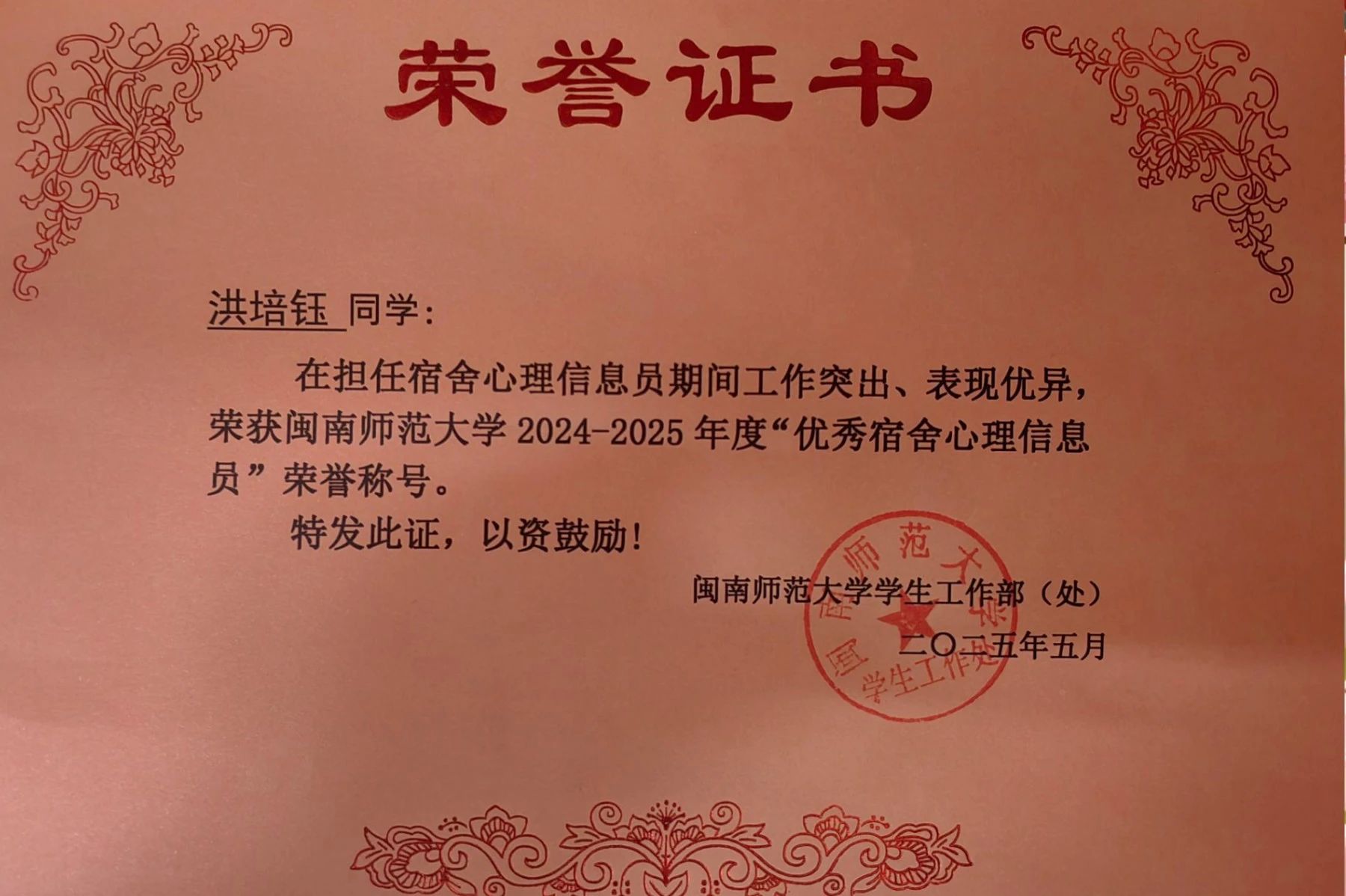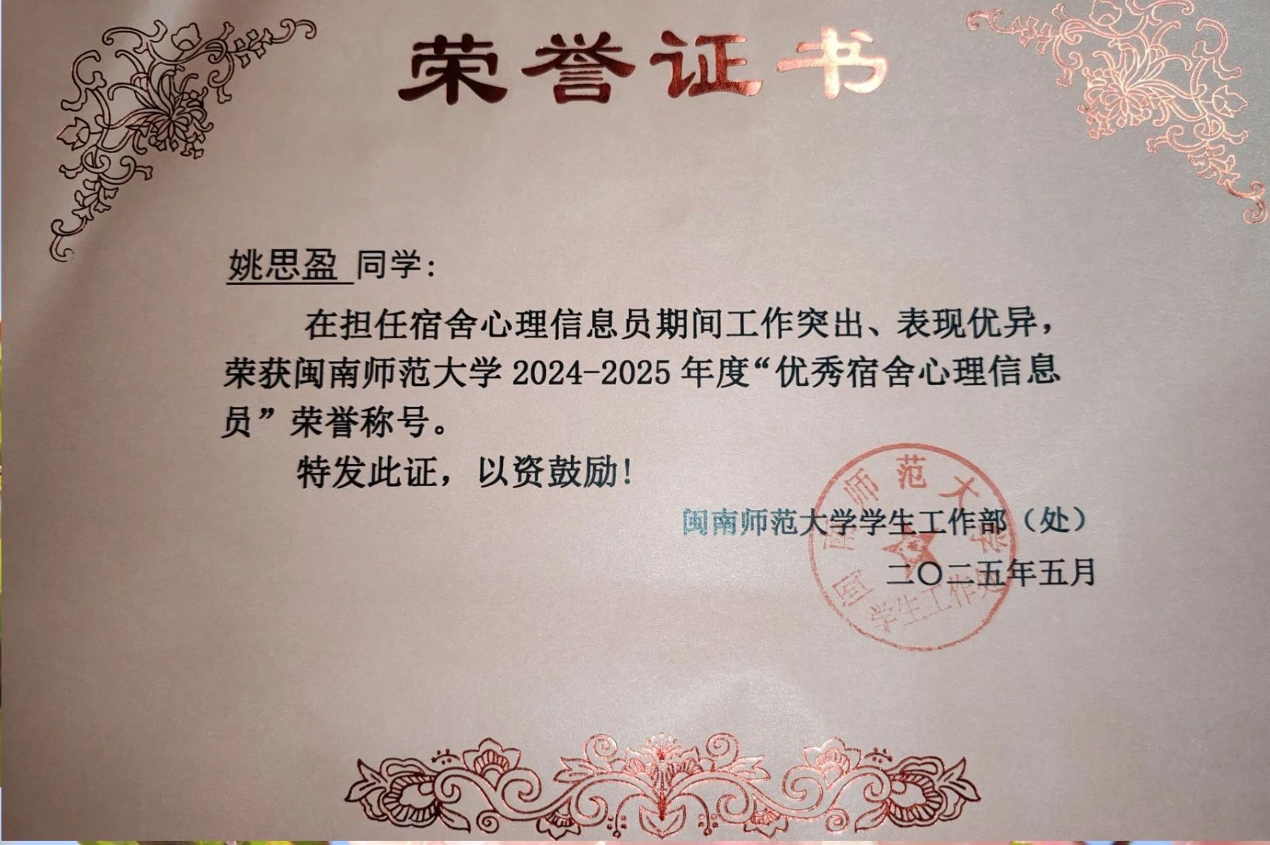 心理辅导站获2023-2025年度优秀心理辅导站荣誉称号,2021级思政1班李雨婷同学荣获优秀班级心理委员,2022级思政2班洪培钰和2023级思政2班魏熠欣、姚思盈、庞量午4位同学荣获优秀宿舍心理委员。
