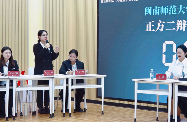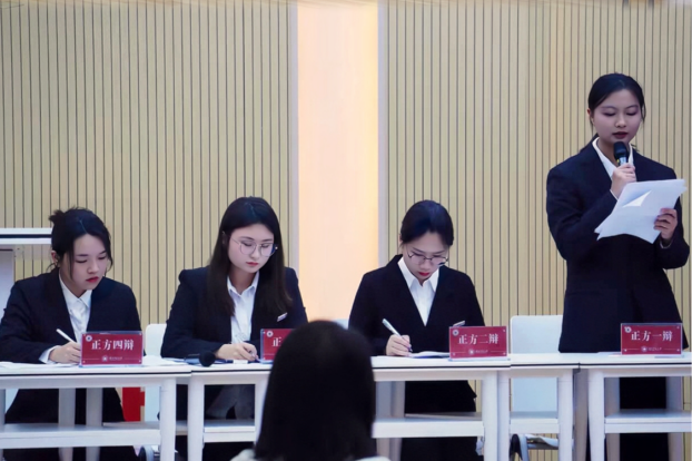 比赛中,正反双方围绕“人生海海,按部就班也挺好,还是肆意长歌也无妨”的辩题展开激烈交锋。双方辩手有破有立,辨法析理,一辩一驳显尽思辩魅力,一招一式展尽明理精神。在这次激动人心的决赛场上,双方辩手们旁征博引,词锋锐利,据理力争,给在场观众呈现了一场辩论盛宴。