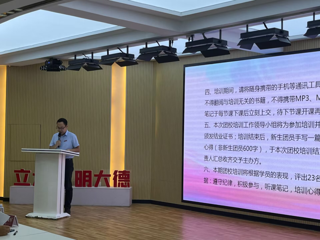 学子要积极响应时代召唤、回应党的号召,争做有理想、敢担当的青年干部。随后,院团委副书记潘怀杰宣读本次团校培训纪律须知,优秀团员代表胡紫嫣进行发言。