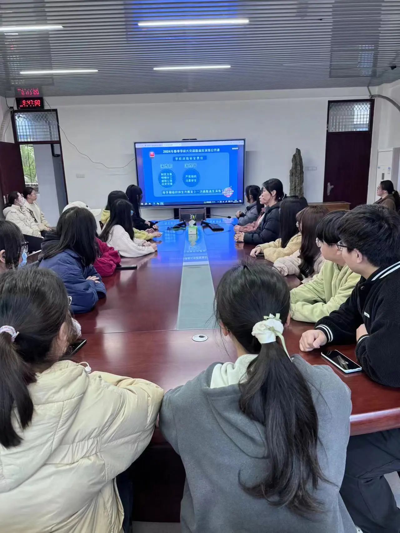 师生于综中404观看学习《2024年春季学校火灾疏散逃生演练公开课》。(通讯员 郑语萍)