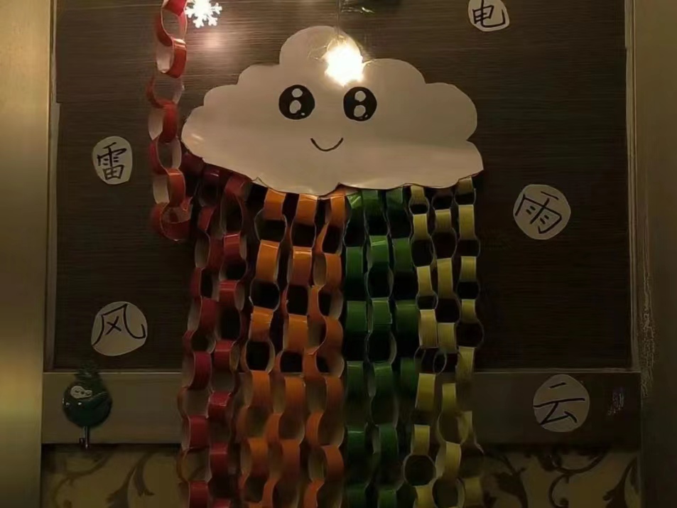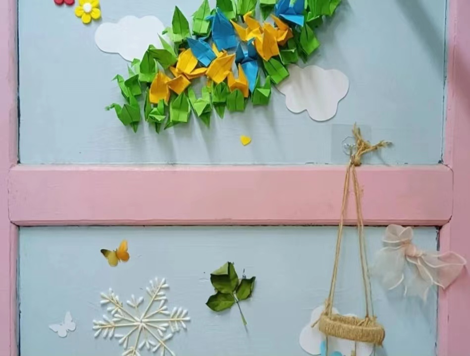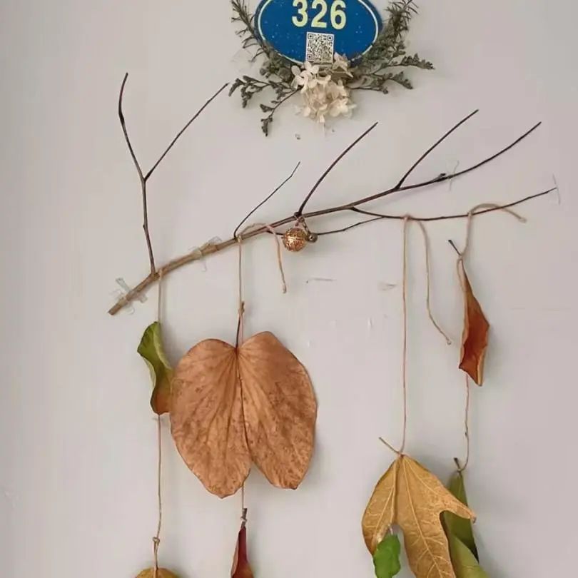 活动中,D北113的同学们利用蜡面彩纸制作气候云朵装饰,用纯色气球设计纯手工纸糊灯笼,用外采到的落花枯叶完成干花装饰,用废弃的鸡蛋托装扮氛围感彩灯,大家一个一个捏成的轻粘土小花,一笔一笔画出的装饰画都让宿舍变得特别温馨。