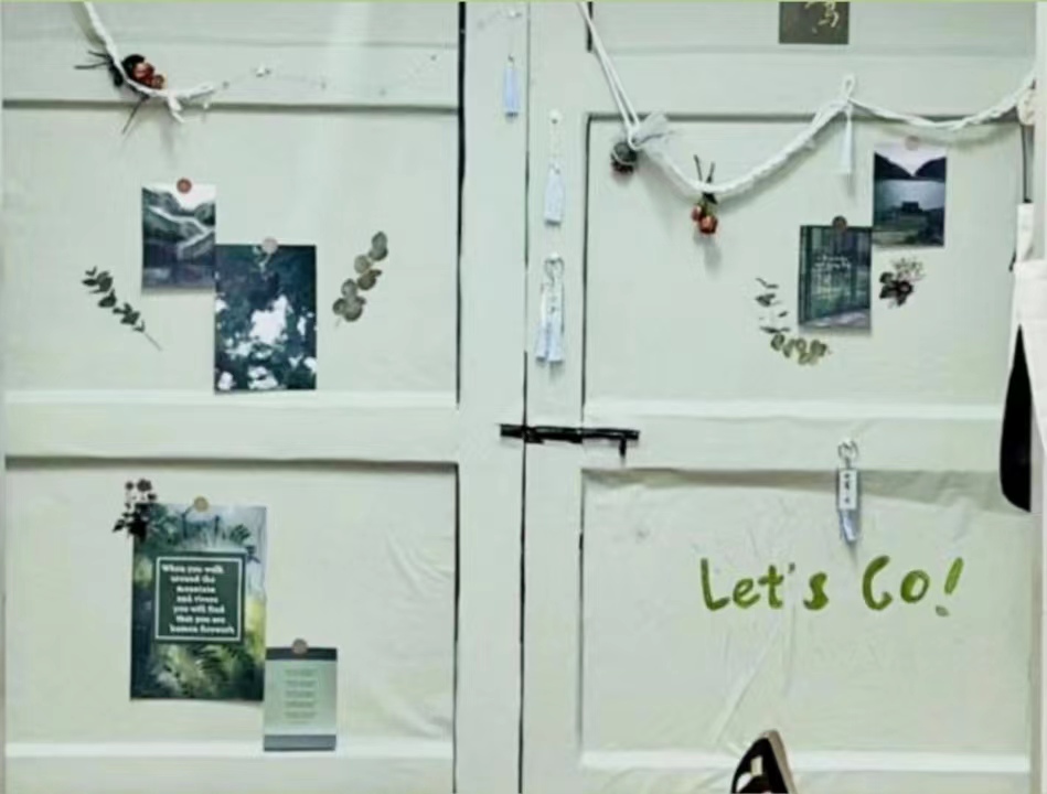 用鲜花与落叶装饰宿舍大门,契合秋季,并就地取材,废物利用。大门背面,增添明信片的元素,代表着“传递”。贴在浴室的海报,突出保护海洋的重要性。另一扇大门,选取绿色壁纸可在学习疲惫眼睛不适时,起到放松的作用。“green”的花字和手画的小花是整个主题的体现。洗手池贴了些节约用水的贴纸,该宿舍希望保护环境和节约用水,从每一处细节做起。