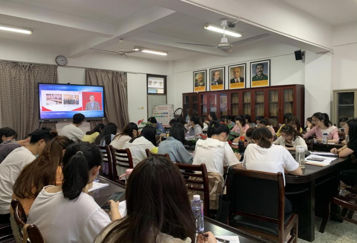 4月24日下午,人兽性交 组织学生在综合楼中区404收看了全国大学生“同上‘四史’思政大课”的直播。