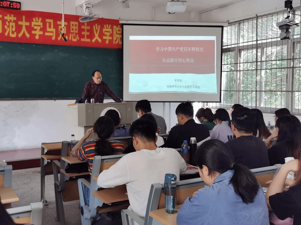 于综南201举行第十八期党校培训第六讲。本讲以《学习党的百年辉煌历史,矢志践行初心使命》为主题,由吴学兵教授主讲,全体入党积极分子参与培训。