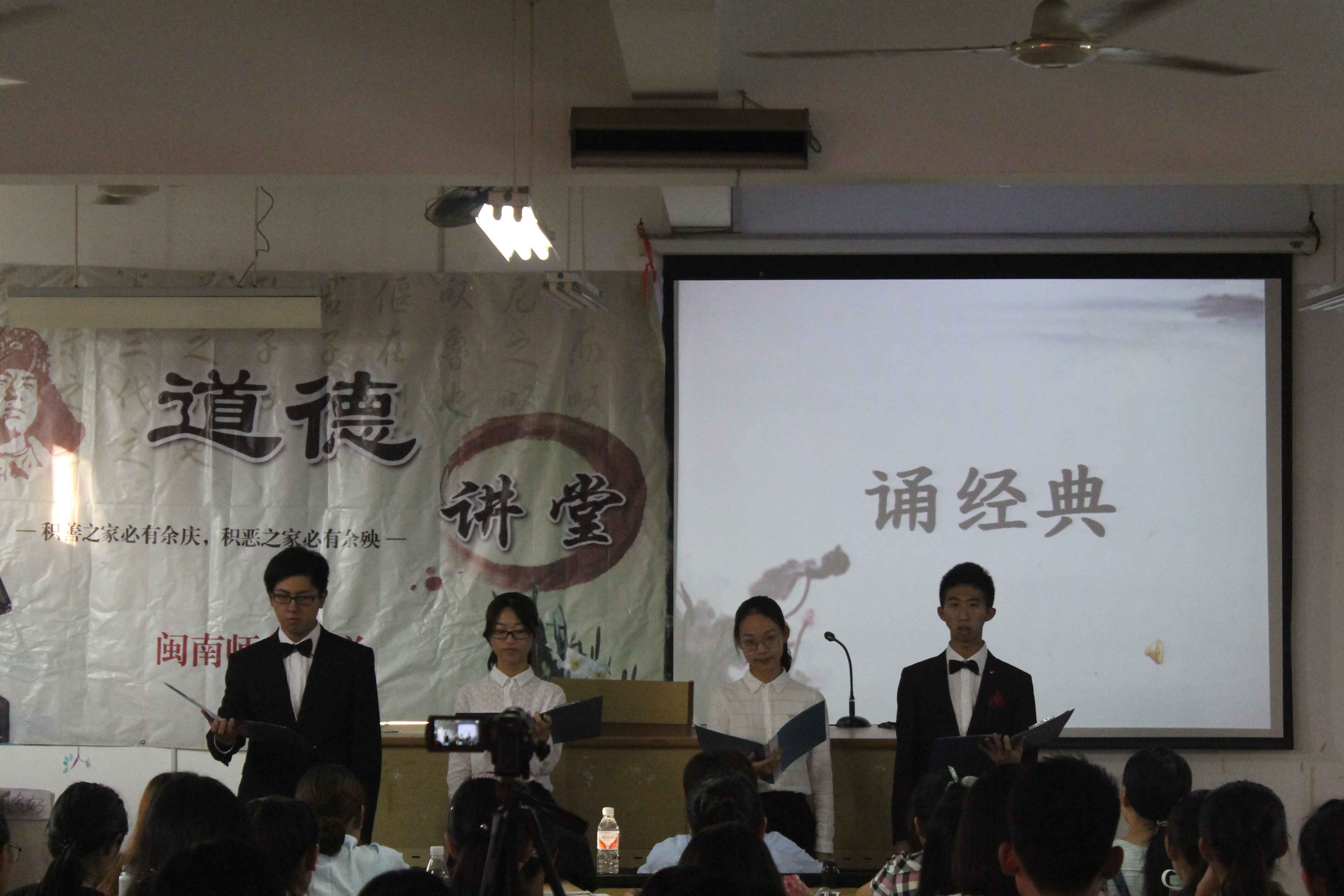 活动分七个环节依次进行。首先,全体人员起立静默三分钟以自省。而后,由新生代表带领大家齐唱《公民道德歌》,伴随着歌声,四位同学声情并茂的朗诵也使在座同学充分感受到道德的力量。随后的小品表演、个人感悟交流、对“德”字鞠躬以及宣誓四个环节更是将活动推向高潮,同学们纷纷表示要以徳立身,严于律己,争做优秀社会公民。最后,此次活动在”送一份礼物”中落下帷幕。