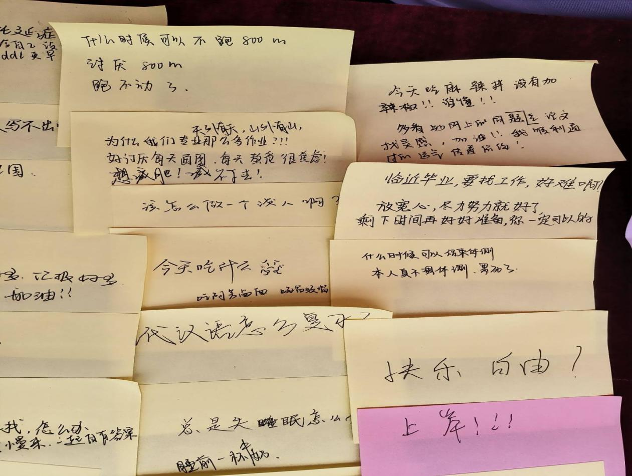 弦歌广场上举行“心灵树洞”活动。活动现场,同学们在便利贴上写下自己的心理烦恼和困惑,同时解答他人的心理困惑。此次活动为学生们提供了一个释放心理压力的平台,鼓励了学生积极面对生活。