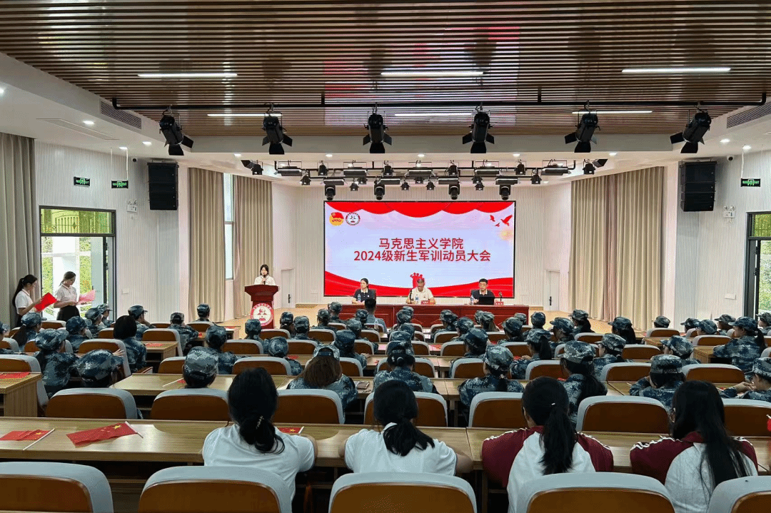 于东门马院礼堂召开2024级新生军训动员大会。会议由辅导员助理王婷主持,学院党委副书记邓战军,辅导员沈书伊、任程龙出席,全体2024级本科生参加。
