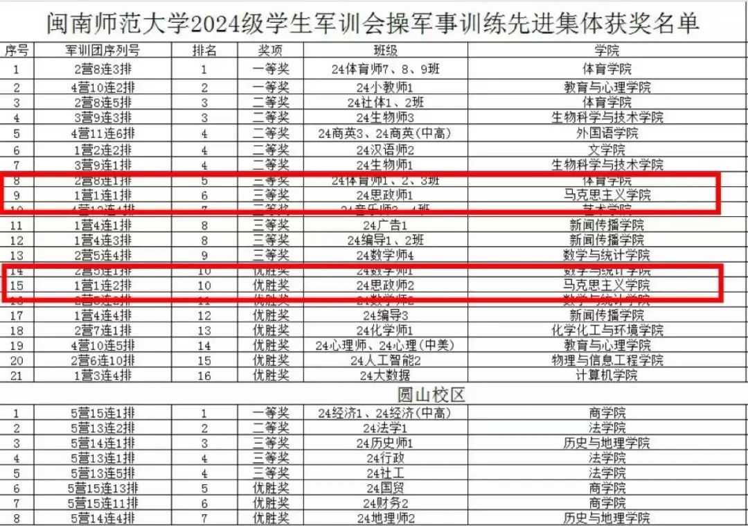 24思政一班所在的一营一连一排荣获军训会操三等奖、24思政二班所在的一营一连二排夺得军训会操优胜奖。(通讯员 李颖诺)