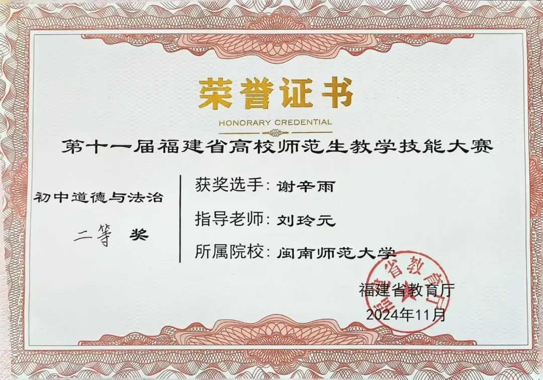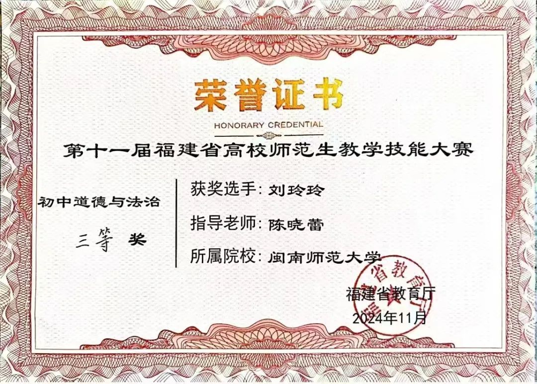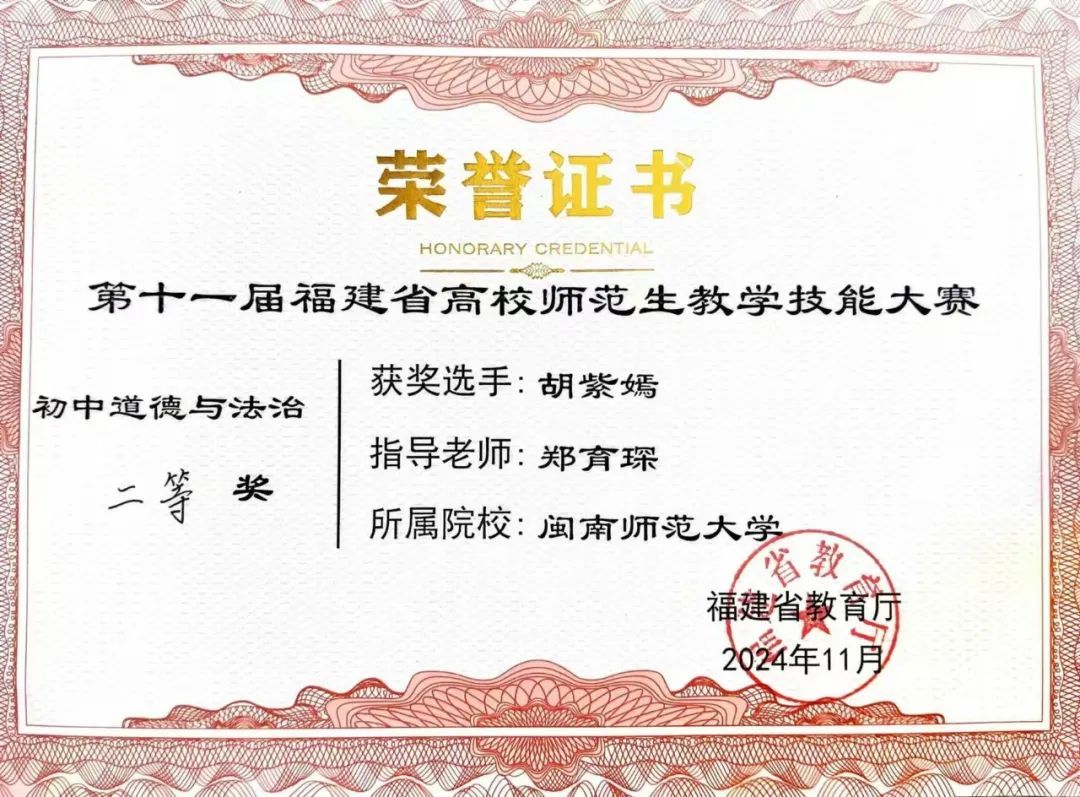 11月16日,由福建省教育厅主办的第十一届福建省高校师范生教学技能大赛在泉州师范学院举行。在人兽性交 刘玲元、郑育琛、陈晓蕾3位老师的指导带领下,人兽性交 21思政1班胡紫嫣、21思政2班谢辛雨荣获二等奖,21思政1班刘玲玲荣获三等奖。本次比赛充分展现了人兽性交 学子良好的职业素养和专业水平。未来人兽性交 将进一步加大对教师队伍的培养力度,推进教师专业化建设,为教育事业蓬勃发展贡献力量。
