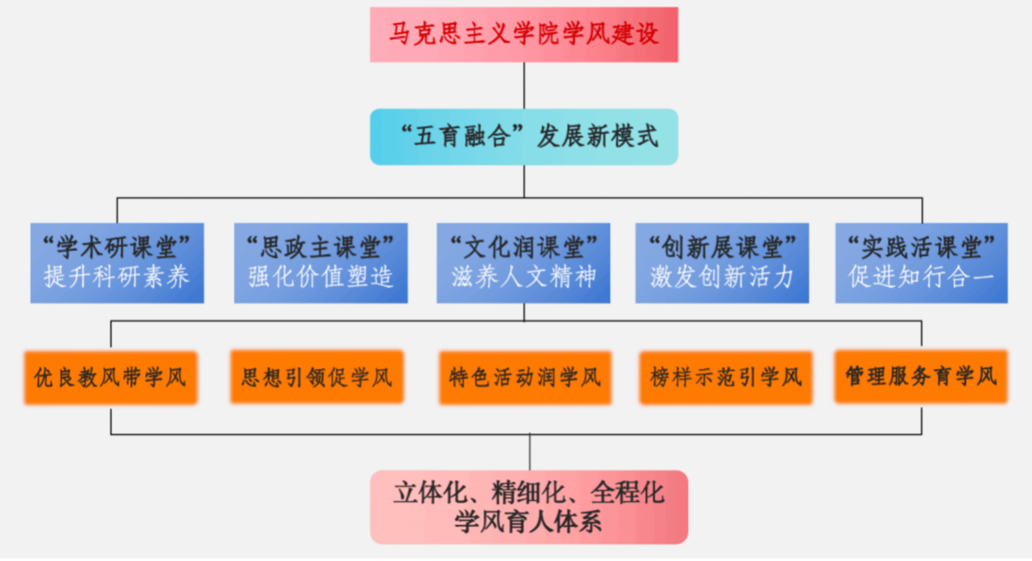 “五育融合”发展新模式旨在以思想引领促学风、以优良教风带学风、以管理服务育学风、以特色活动润学风、以榜样示范引学风,从而培养新时代理想信念坚定、业务知识扎实、综合素质过硬的青年马克思主义者。