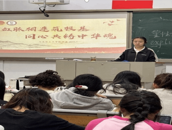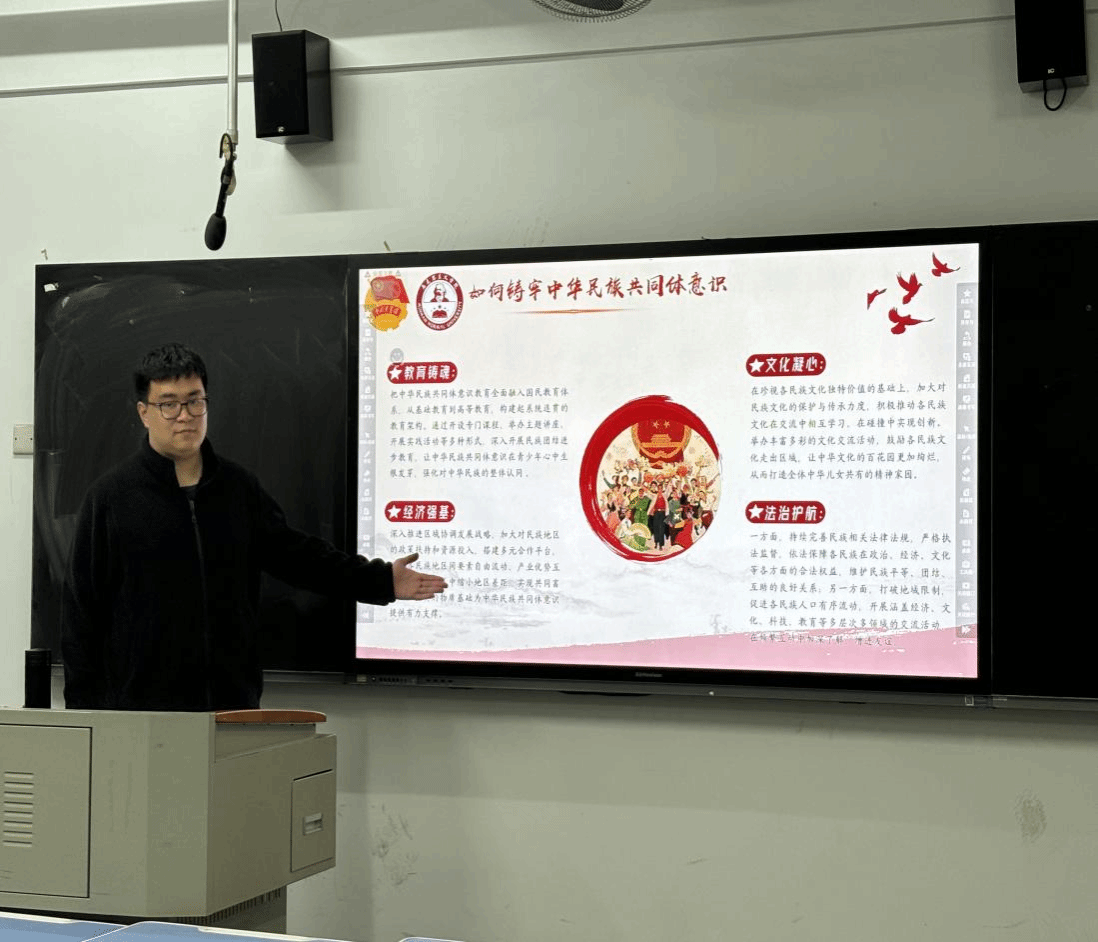 各班级团支部紧扣“铸牢中华民族共同体意识”,以理论为基、实践为桥,充分发挥创新思维,通过理论学习、案例剖析、互动讨论等多样化的形式有序开展,系统学习中华民族共同体意识理论体系,深入探讨其在全面建设社会主义现代化国家新征程中的重要作用。班会期间,同学们积极互动,通过情景模拟、知识竞答等环节,引导同学们树立“铸牢中华民族共同体意识”的理想信念,厚植团结爱国之情。激励同学们在实现中华民族伟大复兴的征程中贡献智慧与力量,让民族团结之花在新时代绽放更绚丽的色彩。值得一提的是,23思政一班通过“共绘民族地图”这一创新形式,将理论学习与实践体验相结合,这一寓教于乐的沉浸式体验,以指尖的温度传递文化认同,用视觉语言诠释民族团结的时代内涵,成为班会中一抹亮色。