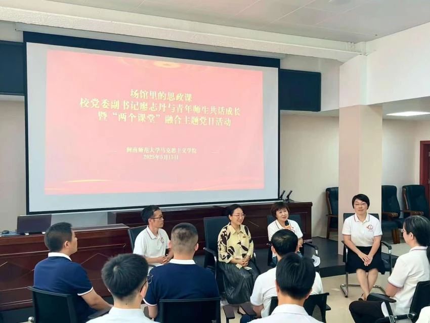 党委副书记廖志丹老师深入课堂,与2023级地理、历史专业30名学生围绕“如何拼搏出真我风采”展开交流与讨论。张胜岚、周启帆等同学就如何提升个人职业规划能力、如何舒缓压力、调整心态,找到可持续的奋斗路径等困惑问题与廖志丹老师进行了交流,廖志丹老师在交流中勉励在场学子:“青春有无限可能,要敢于实践、敢于试错、敢于创新,希望你们在民族复兴赛道上跑出加速度”。交流中,廖志丹副书记与所联系的马院教工第四党支部教师党员亲切交流,鼓励青年教师要“充分利用地方特色场馆资源,推动思政课程实践创新。”