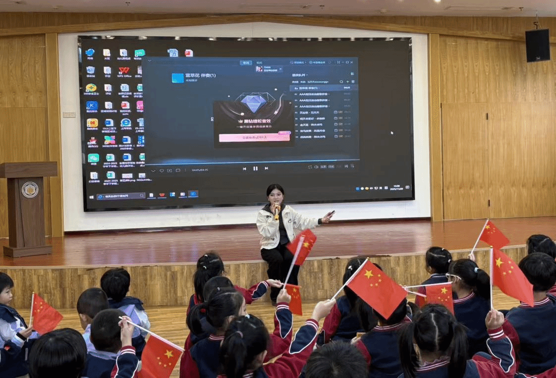 研究生吴婧同学带来经典歌曲《萱草花》,温柔的旋律萦绕耳畔,孩子们手持小国旗轻轻跟唱,脸上洋溢着灿烂的笑容,纯真的情感在悠扬歌声中静静传递,爱国情感在潜移默化中逐渐升华,将活动氛围推向温馨高潮。