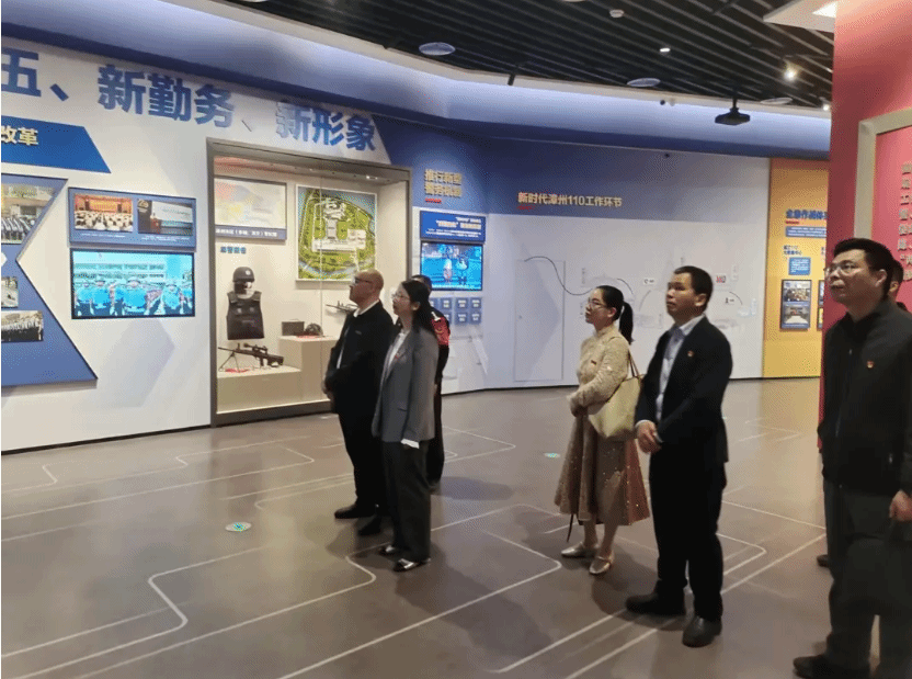 在讲解员的引导和漳州110支队政委庄长发的陪同下,学院一行实地参观了漳州 110 事迹展览馆(忠诚馆)。展馆以“忠诚铸魂、初心为民、科技赋能、精神升华”为核心理念,通过五大核心展区、十大亮点展项,以“警队成长线+群众故事线”双线叙事模式,全面展现了漳州110的发展历程。从初创时期秉持“人民的困难就是我们的困难”的初心,到如今构建“快派快处、快破快挽、快督快结、快奖快惩”的全息作战体系,馆内的一件件实物、一段段影像,生动诠释了漳州110精神的时代内涵,让学院领导一行近距离深刻感悟到这面全国公安系统旗帜背后的初心与担当。