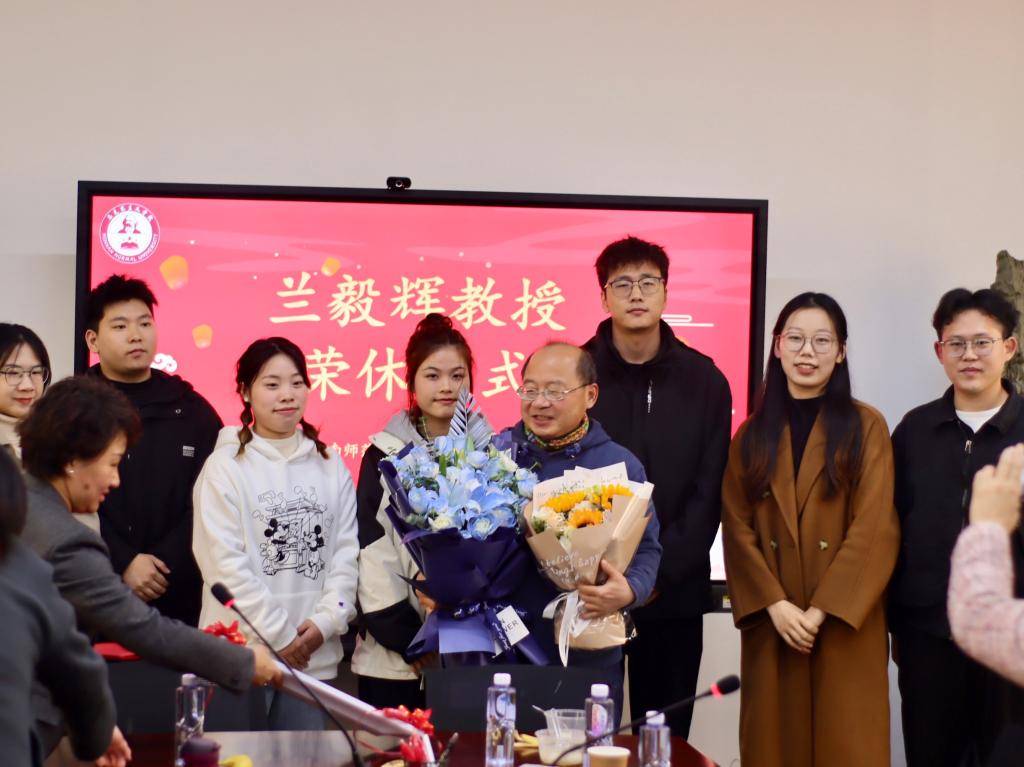 学院领导班子成员为兰毅辉教授颁发荣休纪念证书与纪念品、学生代表为兰毅辉教授献花。