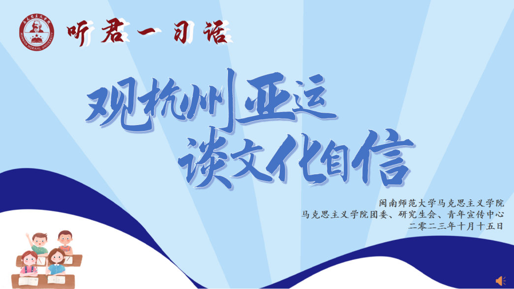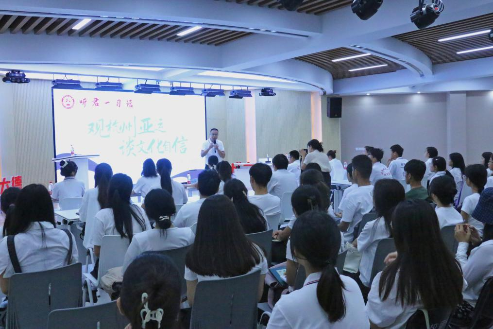 蔡毅强教授结合亚运会精彩片段与青年担当进行分享何为文化自信,他表示以习近平同志为核心的党中央始终坚持引领推动中华优秀传统文化创造性转化、创新性发展,在波澜壮阔的伟大实践中,以时代精神激活中华优秀传统文化生命力,为民族复兴立根铸魂。由此,他着重表明当代青年要敬仰中华优秀传统文化,做到明体达用,体用贯通,坚定文化自信,凝聚中华力量。
