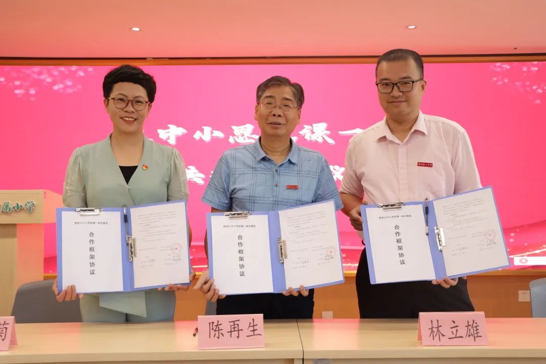 陈再生院长代表学院与结对共建学校签署了共建协议。签约仪式结束后,现场还启动了漳州市大中小学师生“感悟思想伟力 凝聚奋进力量——学习贯彻习近平新时代中国特色社会主义思想主题教育”网络知识竞赛。学院青年教师陈晓蕾与龙文附小学生行了交流互动,她结合中国女排事迹和漳州籍国家体操队队员邱祺缘的事迹,鼓励同学们努力拼搏,树立继续向更大舞台挑战的决心和信心。