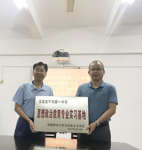 在平和一中举行教育实习基地签约暨授牌仪式。院长陈再生、副院长林海燕、思政系主任景云,平和一中校长张元祥、副校长黄俊荣、平和一中初中部、高中部政治教研组组长和本学期到平和一中实习的五位学科教学(思政)专业研究生参加了仪式。