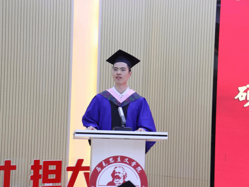 即将赴厦门大学攻读博士学位的朱崴浩作为研究生毕业生代表发言,他回顾了在学院的求学时光和难忘的申博之旅。他感谢每位老师的耐心教导,感谢学院和学校的悉心培养,对一路上帮助过自己的导师、专业老师、领导和辅导员表达了诚挚的感谢,并表示将时刻铭记作为新时代马克思主义者的崇高使命与神圣责任,坚定不移地成为马克思主义最忠诚的学习者与最务实的践行者,用自己的持续奋斗书写属于“马院人”的青春光彩。