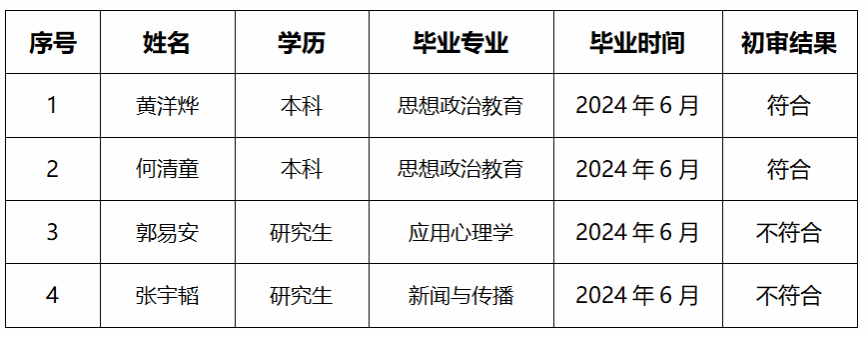 根据《人兽性交 面向2024届毕业生公开招聘科研助理招聘启事》基本条件、招聘岗位及要求,经资格审查,现将审查结果公示如下: