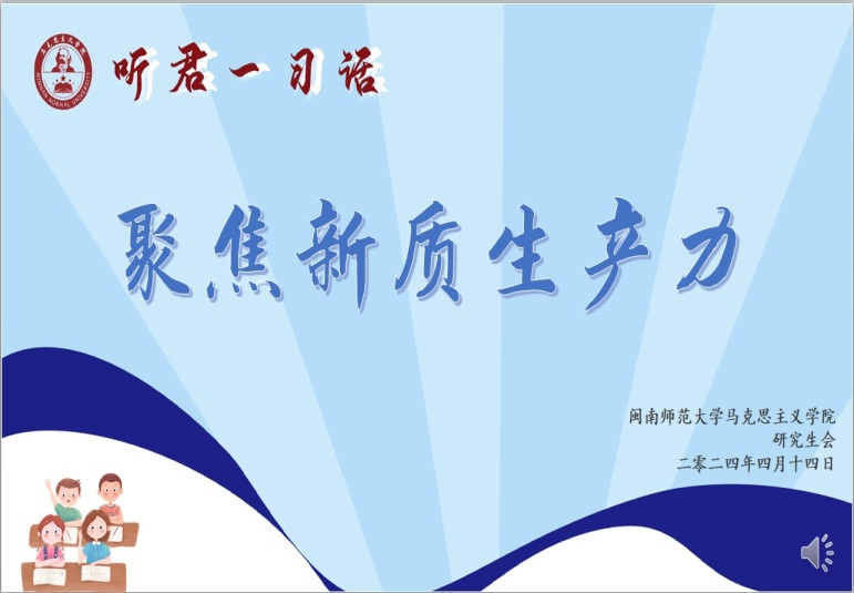 综合楼中区404举行。本次活动主题为“向新而行,创新不止,聚焦新质生产力”,我校新质生产力研究中心博士侯代男副教授参加活动,物理与信息工程学院林文淦、化学化工与环境学院方佳瑜、计算机学院蔡林晟、商学院的段思羽、人兽性交