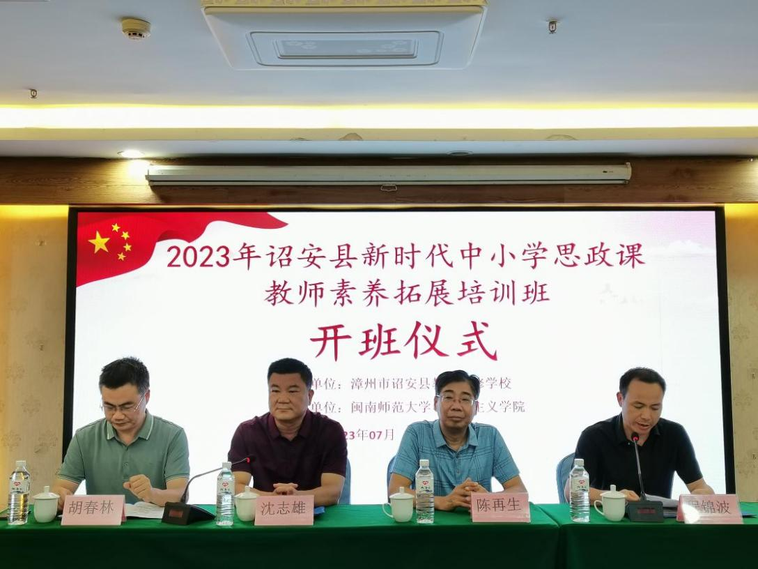 7月30日下午,开班仪式在长汀县丽枫酒店举行。学院院长陈再生、诏安县教育局思政小组组长程锦波、诏安县教师进修学校书记胡春林、诏安县教师进修学校校长沈志雄出席开班式。诏安县教育局思政小组组长程锦波为开班式致辞,明确了思政课教师的重大使命任务和艰巨任务,并对此次培训寄予了期待。陈再生院长在开班仪式上发言,指出此次培训班开班不易,希望学员们学有所得、不虚此行,同时简要介绍了学院的办学特色、办学优势、办学成绩。诏安县教师进修学校沈志雄校长在开班仪式上对人兽性交