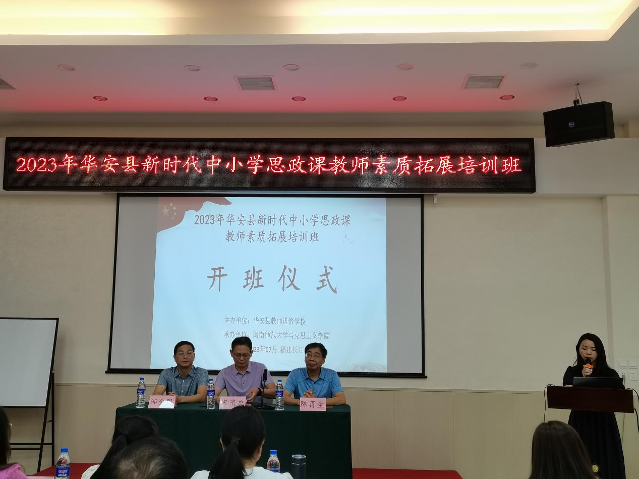 7月3日下午,开班仪式在长汀县金仁大酒店举办,学院陈再生院长、华安县教育局宋清忠副局长、华安县教师进修学校邹金国校长出席开班式。华安县教育局宋清忠副局长为开班式致辞,强调了思政课教师的重大使命任务,对此次培训寄予了殷切期望。陈再生院长在开班仪式上发言,简要介绍了学院的办学特色、办学优势、办学成绩,并寄语学员们在本次培训中提升自我。