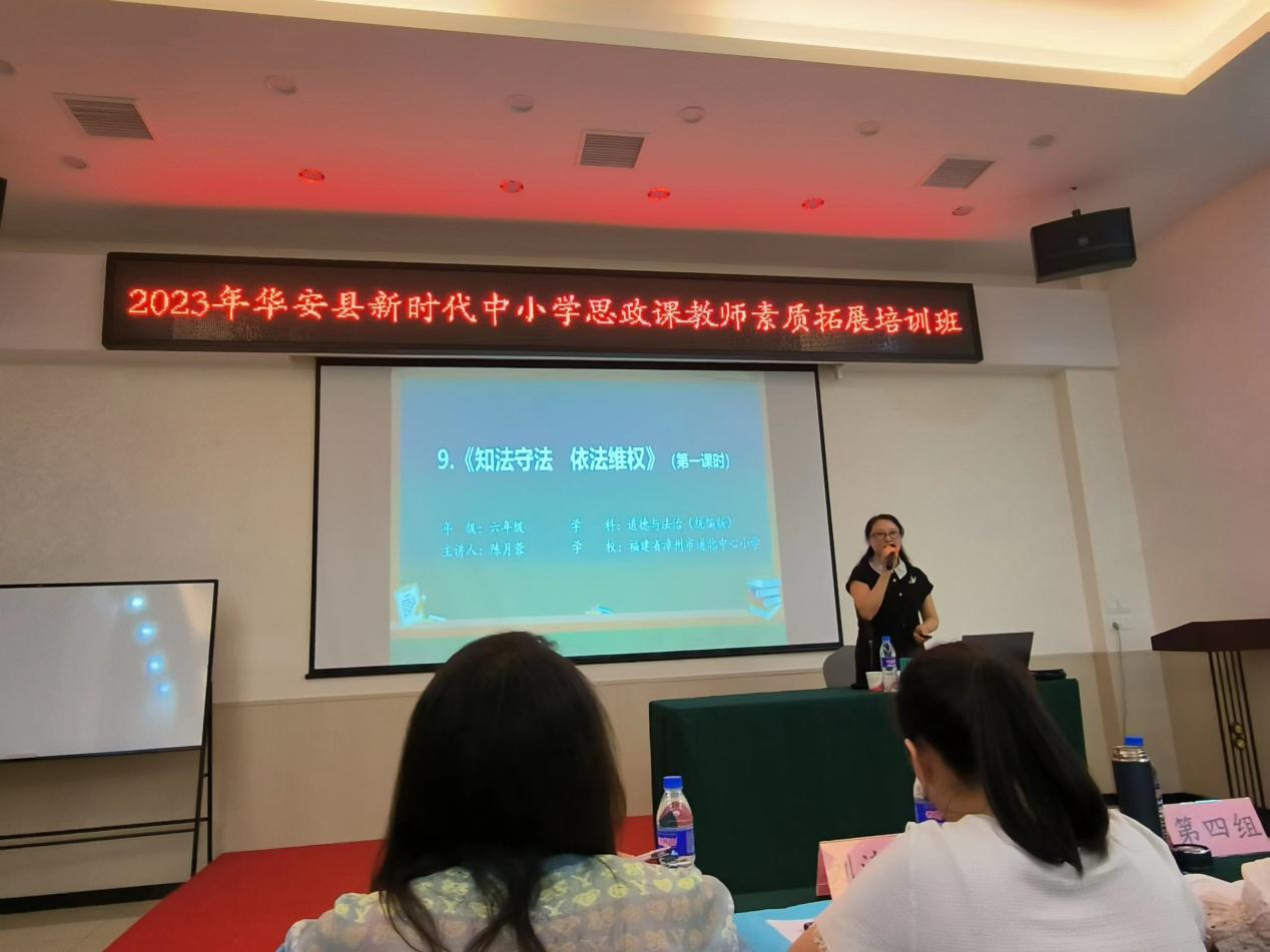 7月4日上午,漳州一中思政课教师刘柳虾老师为学员做了统编版教材必修一《实现中华民族伟大复兴的中国梦》示范课展示和《弘扬女排精神,做“四有老师”》讲座分享。漳州市通北中心小学副书记、陈月蓉老师为学员做了统编版道德与法治六年级上册《知法守法 依法维权》示范课展示和《培养知法守法用法的小公民:六年级法治专册教学谈》讲座分享。