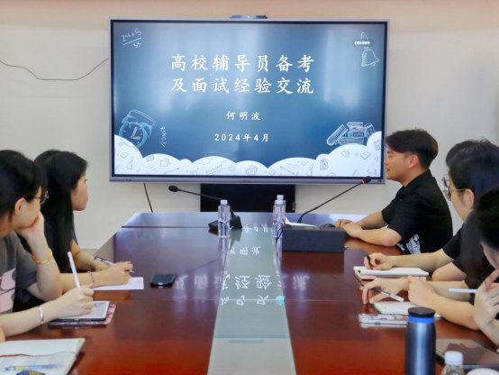 2021级研究生何明波于综合楼中区404做关于高校辅导员备考及面试经验分享会。本次分享会由院团委副书记、研究生辅导员潘怀杰主持,共计50余名在校研究生参与。