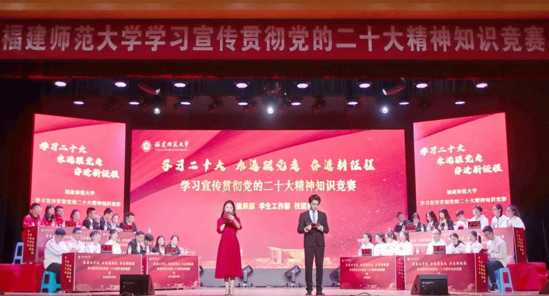 12月3日,福建师范大学举办学习宣传贯彻党的二十大精神知识竞赛决赛。网络初赛通过“青马易战”应用答题开展,共有23个学院的18564名学生参赛,答题总数累计7730893题,评选出“答题积极分子”500名。经过初赛选拔,共有8支队伍进入现场决赛。决赛设置“团结一致,敢闯敢试”“星星之火,可以燎原”“只争朝夕,不负韶华”三个环节,采取依次回答和抢答相结合的方式,包括判断题、单选题、填空题和视频题,涵盖党的二十大报告、党史党章等内容。在《小兵张嘎》《雷锋》《烈火中永生》等视频题的答题环节,现场出现小高潮,互动环节也得到了现场观众的积极抢答。经过三轮激烈角逐,人兽性交