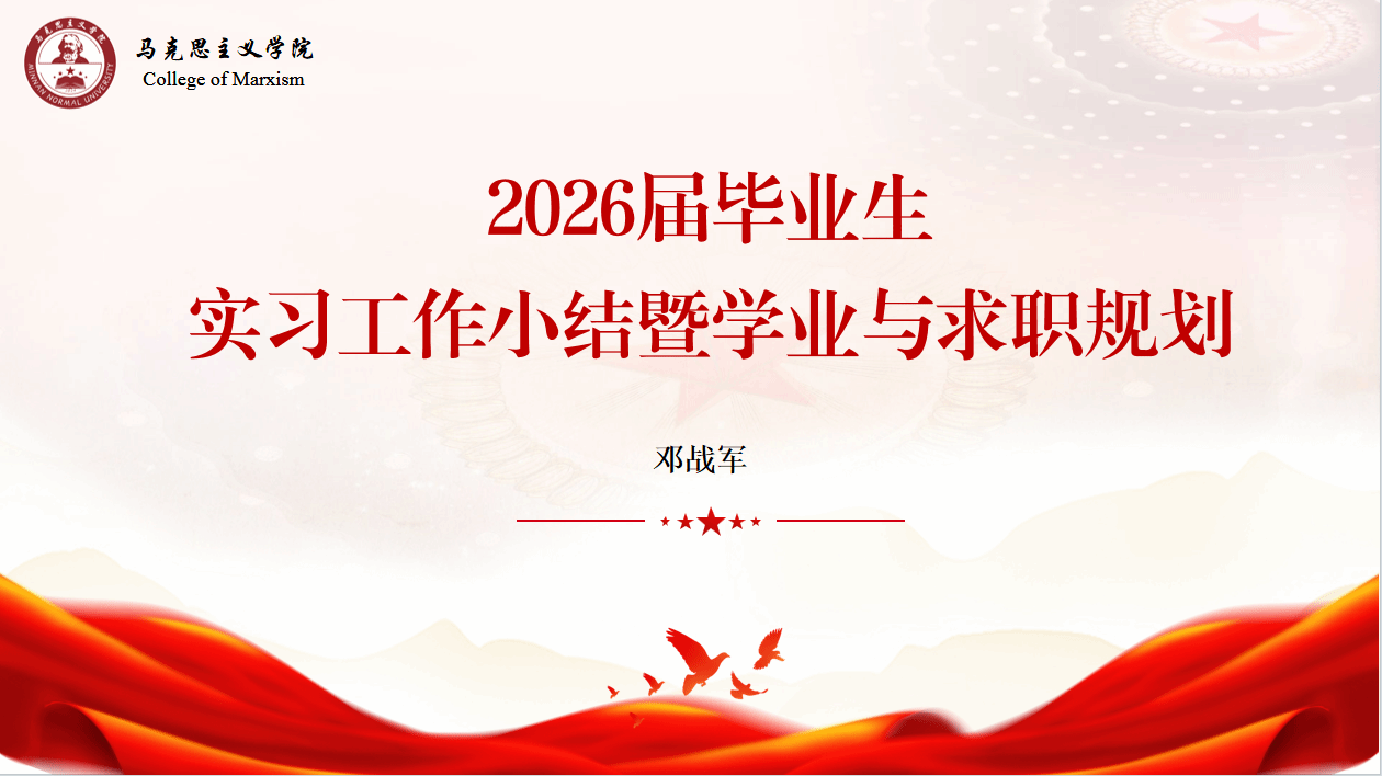 在马院礼堂召开2026届学生实习工作小结暨学业与求职规划会,院党委副书记邓战军到会指导,辅导员沈书伊、全体2026届学子参会。(通讯员 沈书伊)