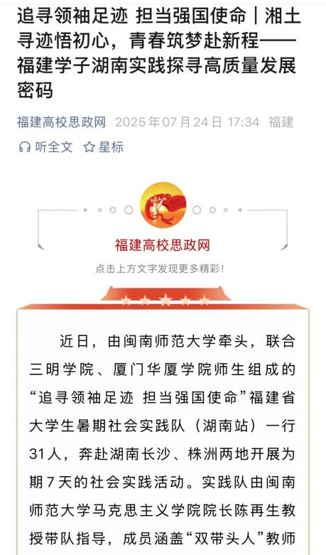 牵头,与三明学院、厦门华厦学院师生组成的“追寻领袖足迹 担当强国使命”2025年福建省大学生暑期社会实践队(湖南站)前往湖南长沙、株洲两地,开展主题社会实践活动。队伍汇聚3校师生,涵盖8个学科,由“双带头人”教师党支部书记、专家、思政课教师以及本硕学生骨干共31人构成。(通讯员 杨纯真)