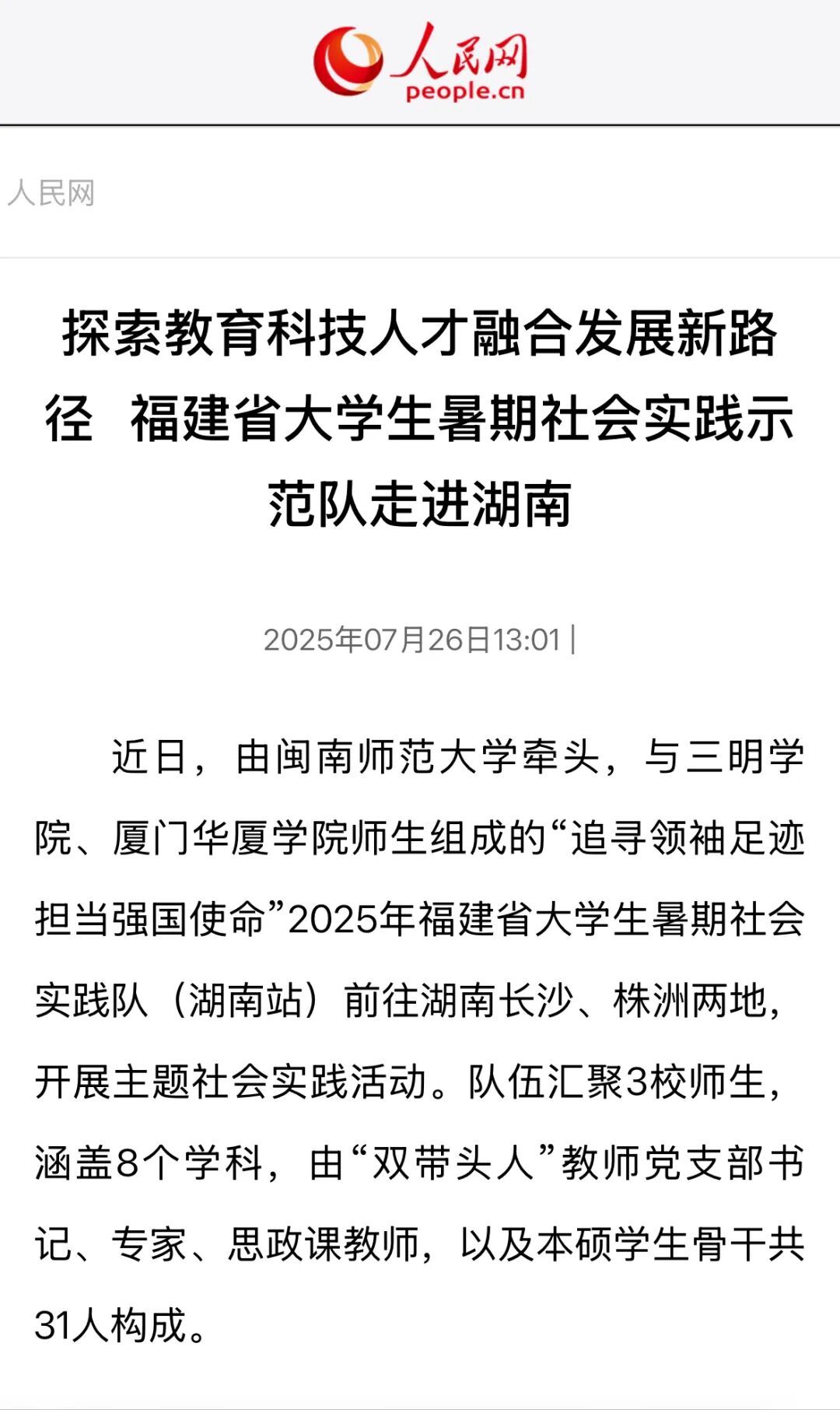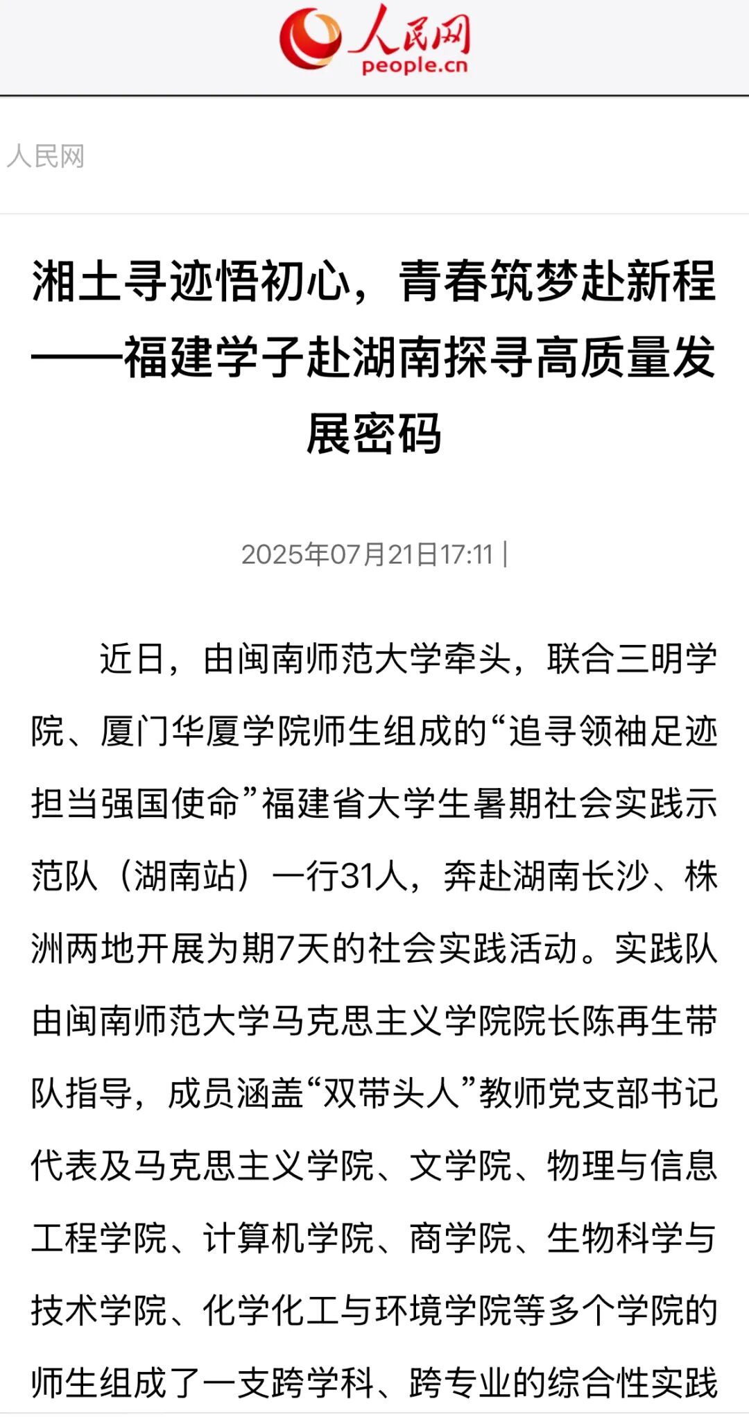 14、人民网:探索教育科技人才融合发展新路径 福建省大学生暑期社会实践示范队走进湖南