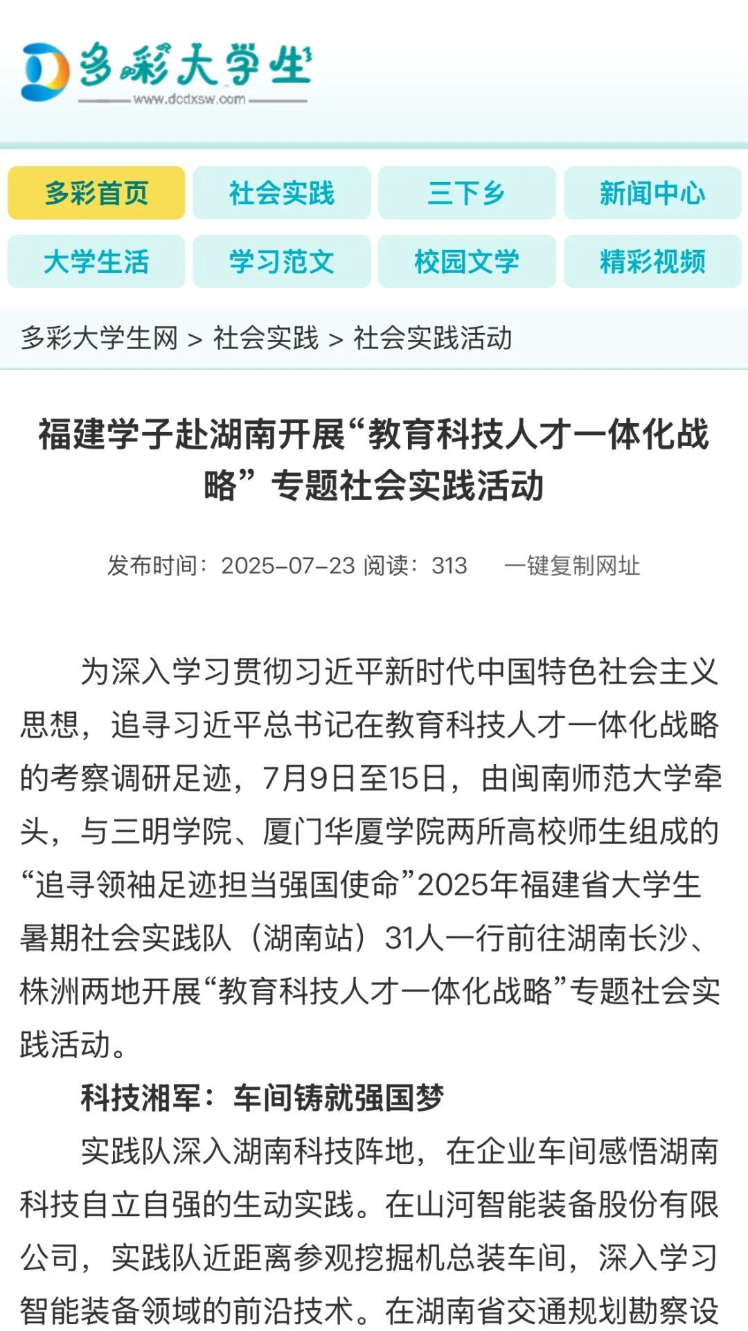 9、多彩大学生网:福建学子赴湖南开展“教育科技人才一体化战略”专题社会实践活动