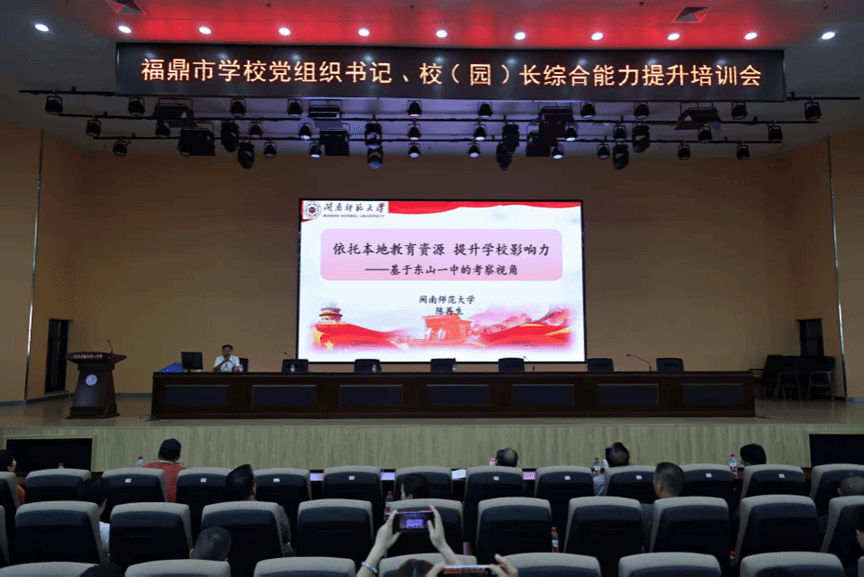 院长陈再生教授在东山一中进行的2025年福鼎市教育系统党组织书记、校(园)长综合能力提升培训班上讲授《依托本地教育资源 提升学校影响力——基于东山一中的考察视角》的专题报告。(通讯员 任程龙)
