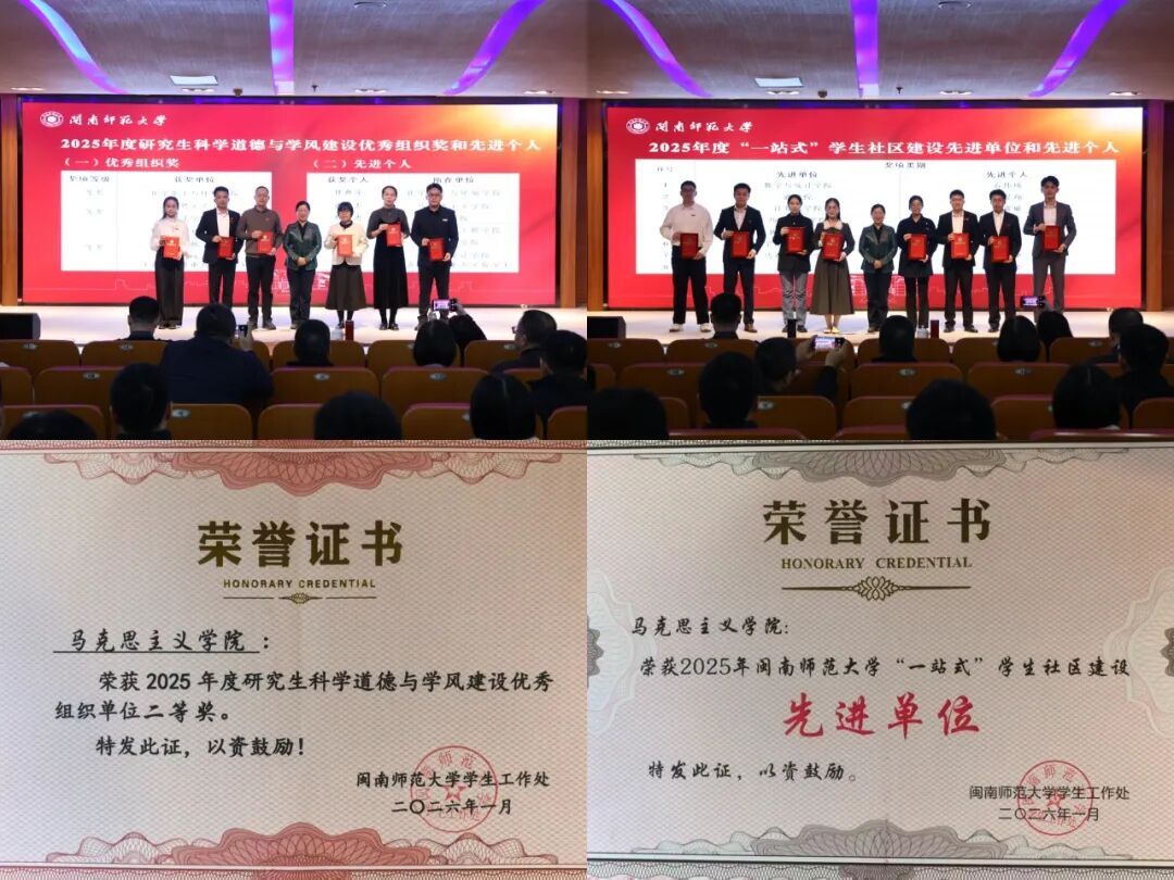 在校2025年学生工作总结表彰大会上荣获“研究生科学道德与学风建设优秀组织单位”和“学生社区建设先进单位”称号,团委书记潘怀杰和辅导员沈书伊获评先进个人。同时,人兽性交