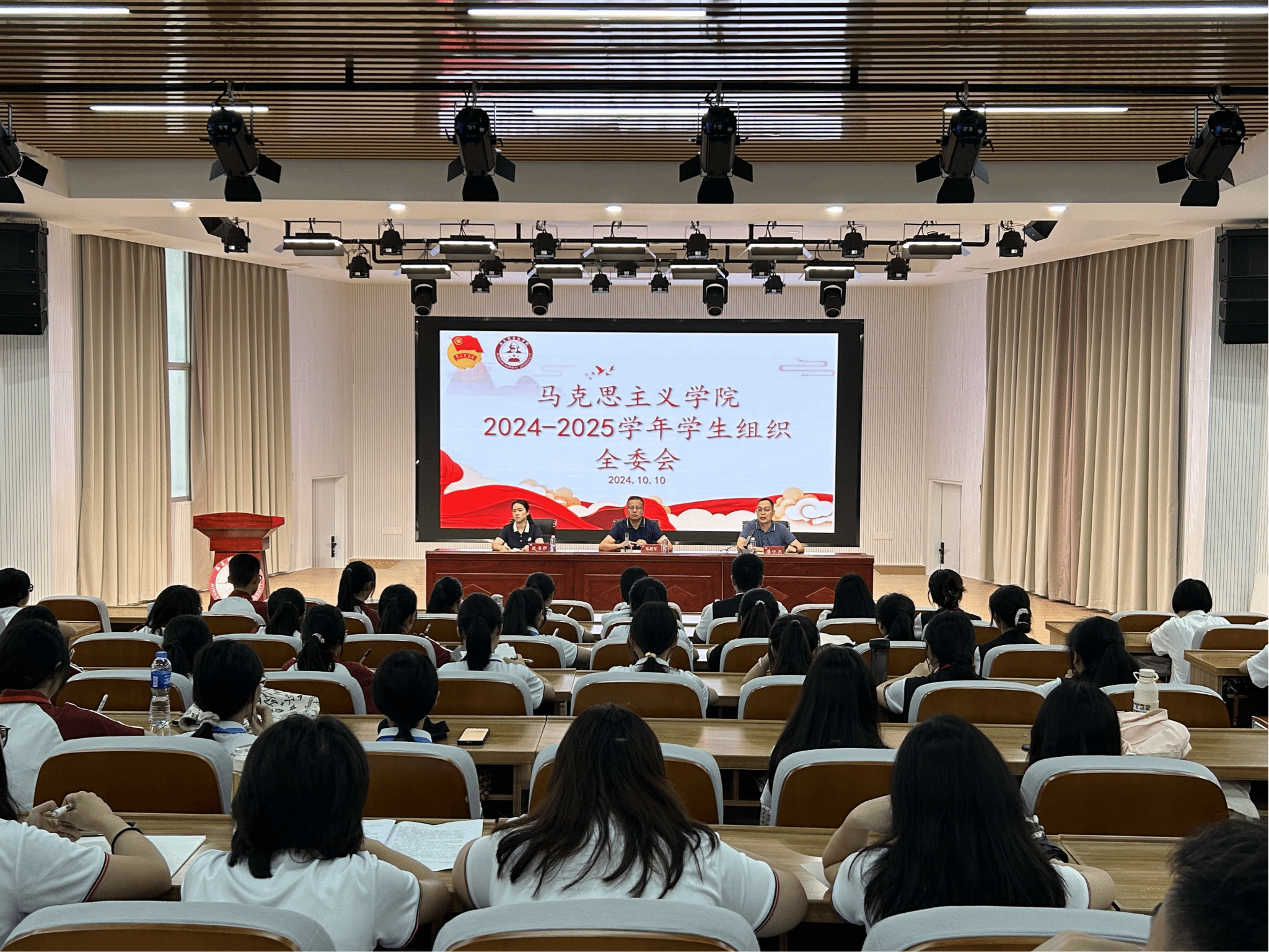 2024-2025学年学生组织全委会,会议由团委副书记潘怀杰主持,党委副书记邓战军、辅导员沈书伊及学院学生组织主要学生干部参加。(通讯员 郑语萍)