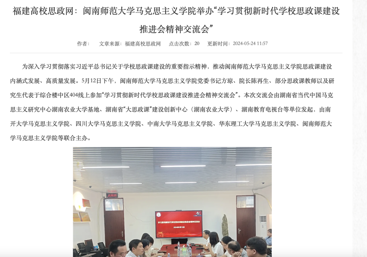 5月24日,由人兽性交 举办的“学习贯彻新时代学校思政课建设推进会精神交流会”受到福建高校思政网平台的专题报道。(通讯员 林晨)