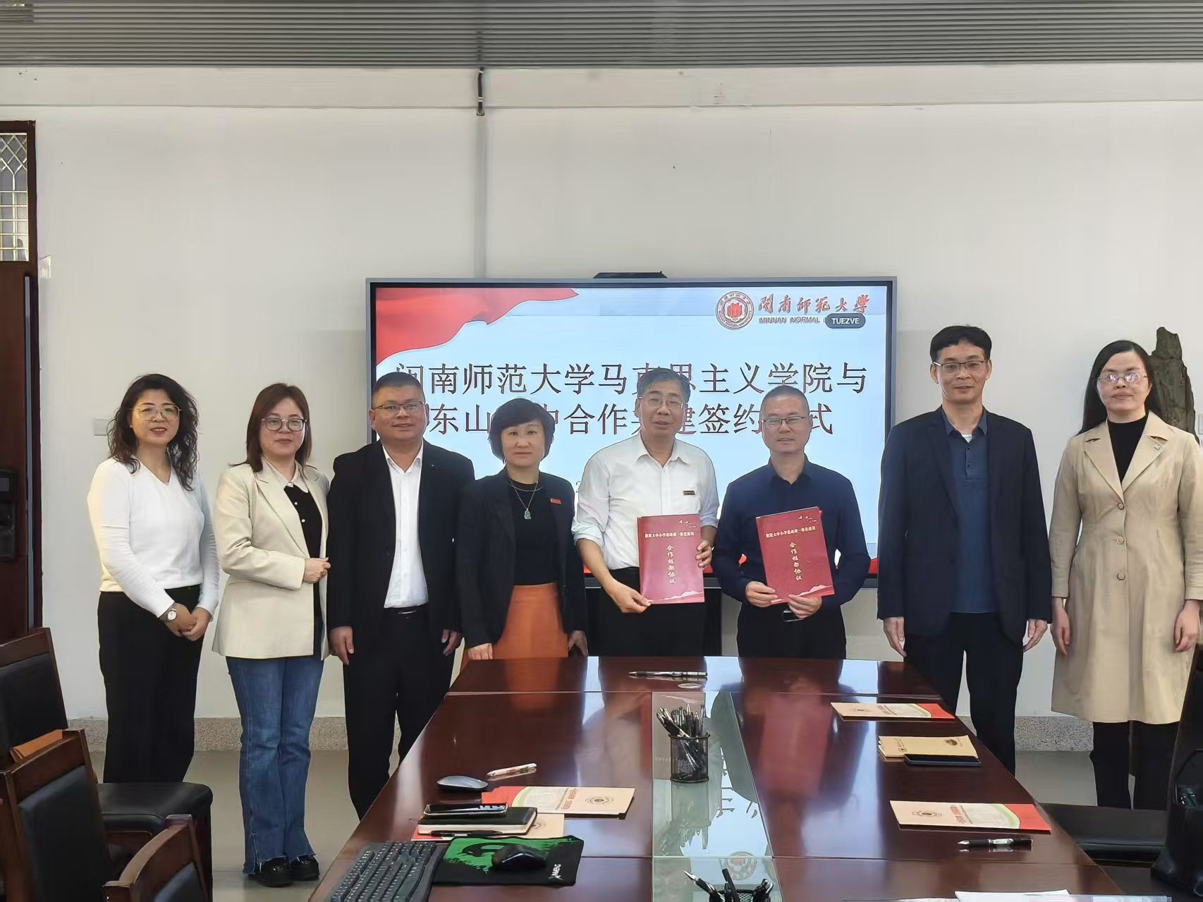 党委书记方琼、院长陈再生、副院长林海燕、毛泽东思想和中国特色社会主义理论体系概论教研室主任林志芳在综合楼404与来宾进行交流。(通讯员 蔡可捷)